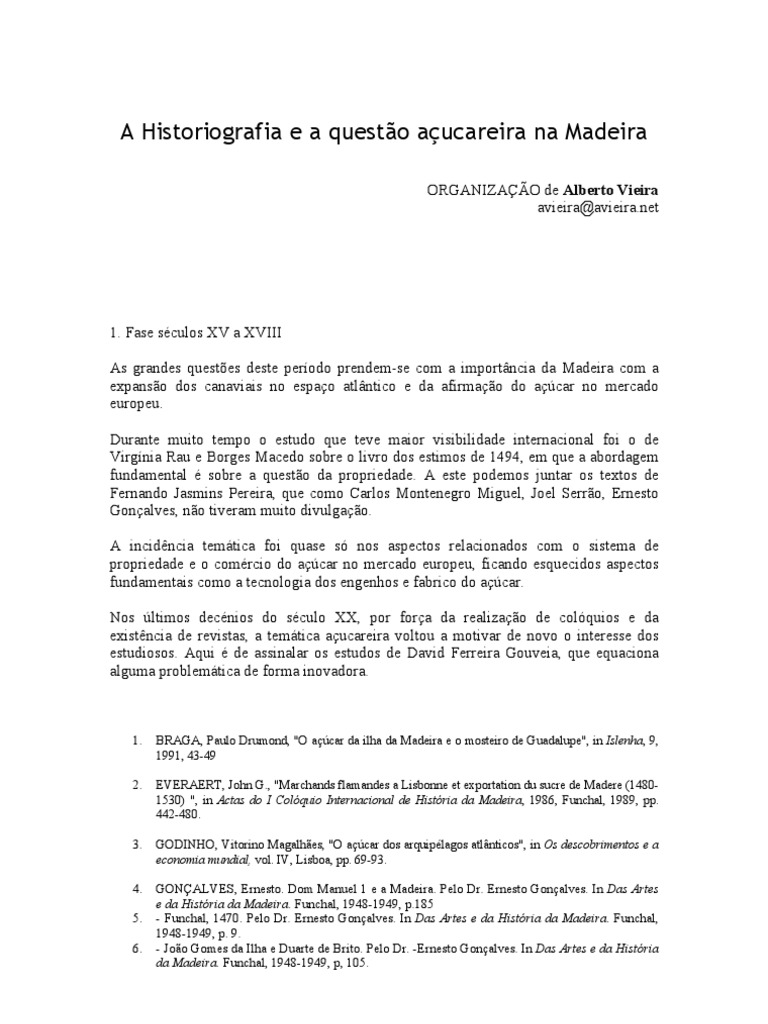 41. VERLINDEN, Charles, "Les débuts de la production et l' éxportation du sucre a Madere. Quel role y jouerent les italiens,, in Studi in memoria de Luigi del Pane, Bolonha, 1982, pp. 308-310.