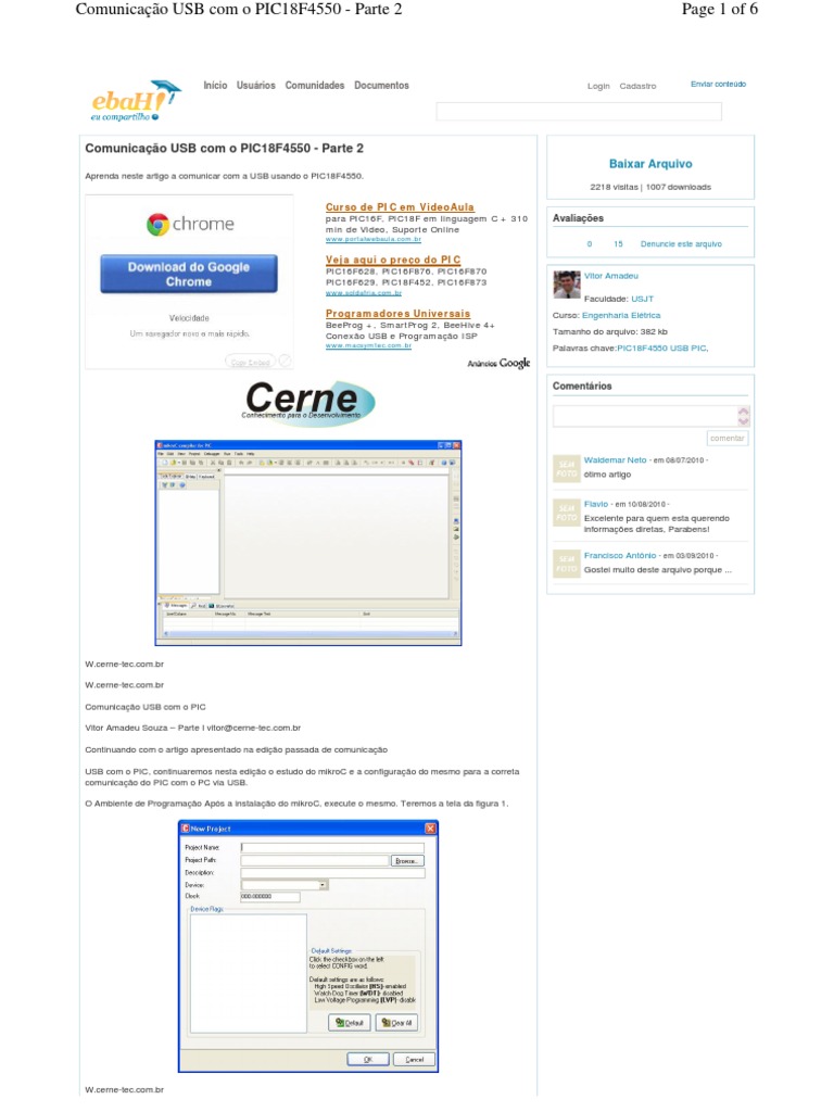 Figura 1 Tela inicial do mikroC O mikroC trabalha com o conceito de projeto, ou seja, sempre que quisermos compilar um determinado cdigo, precisaremos criar um projeto. Neste caso, v no menu Project -> New Project, a tela da figura 2 ser apresentada: Figura 2 Criando um projeto no mikroC No campo Project Name, devemos informar o nome do nosso projeto. Informe neste campo por exemplo, o nome comunicao_usb ou o nome que melhor lhe convier. Em seguida, escolha a pasta onde o projeto ficar salvo, clicando no boto Browse do campo Project Path. O campo Descritption W.cerne-tec.com.br opcional e serve para detalharmos o que o nosso projeto faz, podendo ficar neste exemplo sem preenchimento. O campo clock serve para configurarmos no compilador qual a velocidade de processamento no qual o PIC est funcionando, No nosso caso, apesar do oscilador ser de 4 MHz, escolha o clock de 48 MHz, pois como a srie 18 possui internamente PLLs que permitem aumentar o clock do microcontrolador, neste exemplo iremos utilizar este recurso. No campo Device, escolha o modelo que iremos utilizar neste projeto, neste caso o PIC18F4550. Atravs do campo Device Flags, podemos ajustar os bits de configurao do PIC. Observe na tabela 1 os campos que devem ficar marcados para o correto funcionamento deste exemplo. Configuration Bit PLLDIV_1_1L CPUDIV_OSC1_PLL2_1L USBDIV_2_1L FOSC_XTPLL_XT VREGEN_ON_2L WDT_OFF MCLRE_OFF LPT1OSC_OFF PBADEN_OFF LVP_OFF_4L ICPRT_OFF_4L XINST_OFF_4L DEBUG_OFF_4L Tabela 1 Ajuste de Configurations Bits * Recomendo a leitura do datasheet do PIC18F4550 na parte dos configurations bits para um entendimento melhor dos mesmos. Feito os ajustes apresentados, pressione o boto ok. Agora o mikroC ficar com a tela apresentada na figura 3.