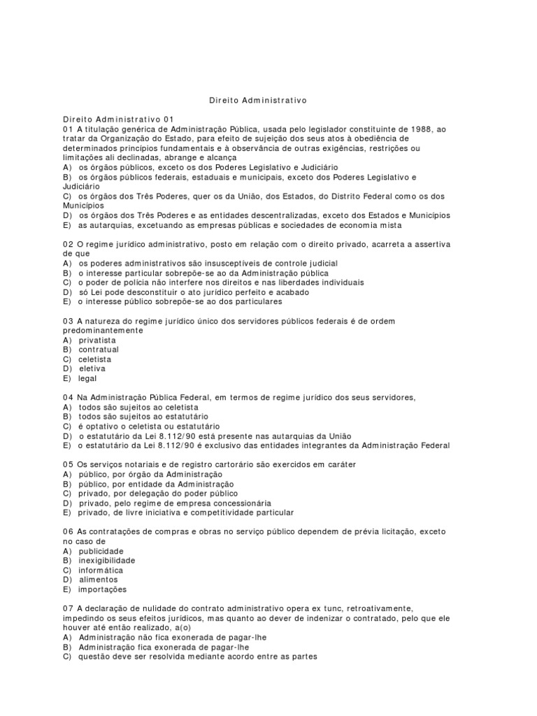 a impessoalidade e a informalidade dos procedimentos administrativos RESPOSTAS Questo 1 alternativa E Questo 2 alternativa C Questo 3 alternativa E Questo 4 alternativa B Questo 5 alternativa D Questo 6 alternativa A Questo 7 alternativa C Questo 8 alternativa D Questo 9 alternativa C Questo 10 alternativa B