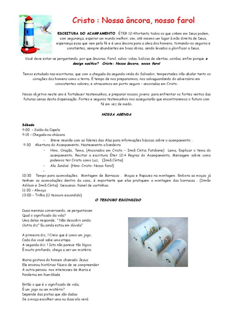 ESCRITURA DO ACAMPAMENTO TER 12:4Portanto todos os que crem em Deus podem, com segurana, esperar um mundo melhor, sim, at mesmo um lugar mo direita de Deus, esperana essa que vem pela f e uma ncora para a alma dos homens, tornando-os seguros e constantes, sempre abundantes em boas obras, sendo levados a glorificar a Deus. Voc deve estar se perguntando, por que ncoras, Farol, salva- vidas, balizas de alertas, cordas, enfim porque o design natico? Cristo: Nossa ncora, nosso farol Temos estudado nas escrituras, que com a chegada da segunda vinda do Salvador, tempestades iro abalar tanto os coraes dos homens como a terra. tempo de nos prepararmos, nos salvaguardando do adversrio em consistentes valores, e atracarmos em porto seguro - ancoradas em Cristo. Nosso objetivo neste ano fortalecer testemunhos, e preparar nossos jovens para enfrentar os fortes ventos das futuras cenas desta dispensao. Fortes e seguros testemunhos nos asseguraro que encontraremos o futuro com f em vez de medo.