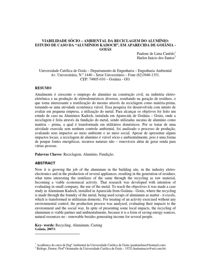 Atualmente é crescente o emprego do alumínio na construção civil, na indústria eletro- eletrônica e na produção de eletrodomésticos diversos, resultando na geração de resíduos, o que torna interessante a reutilização do mesmo através da reciclagem como matéria-prima, tornando-se uma atividade econômica viável. Essa pesquisa foi desenvolvida com intuito de avaliar em pequena empresa, a utilização do metal. Para alcançar os objetivos foi feito um estudo de caso na Alumínios Kadoch, instalada em Aparecida de Goiânia – Goiás, onde a reciclagem é feita através da fundição do metal, sendo utilizadas sucatas de alumínio como matéria – prima, a qual é transformada em utilitários domésticos. Por se tratar de uma atividade exercida sem nenhum controle ambiental, foi analisado o processo de produção, avaliando seus impactos ao meio ambiente e ao meio social. Apesar de apresentar alguns impactos locais, a reciclagem de alumínio é viável sócio e ambientalmente, pois é uma forma de poupar fontes energéticas, recursos naturais não – renováveis além de gerar renda para várias pessoas.