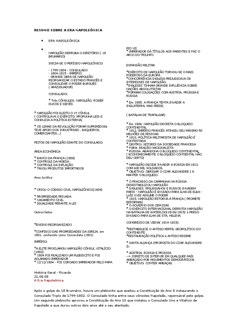 Histria Geral - Ricardo 21.08.08 A Era Napolenica Aps o golpe do 18 Brumrio, houve um plebiscito que aceitou a Constituio do Ano 8 instaurando o Consulado Triplo de 1799-1802. O Consulado tinha entre seus cnsoles Napoleo, reponsvel pelo golpe. Um segundo plebiscito aprovou a Constituio do Ano 10 que instalou o Consulado Uno e Vitalcio de Napoleo e que durou outros dois anos at o seu atentado.