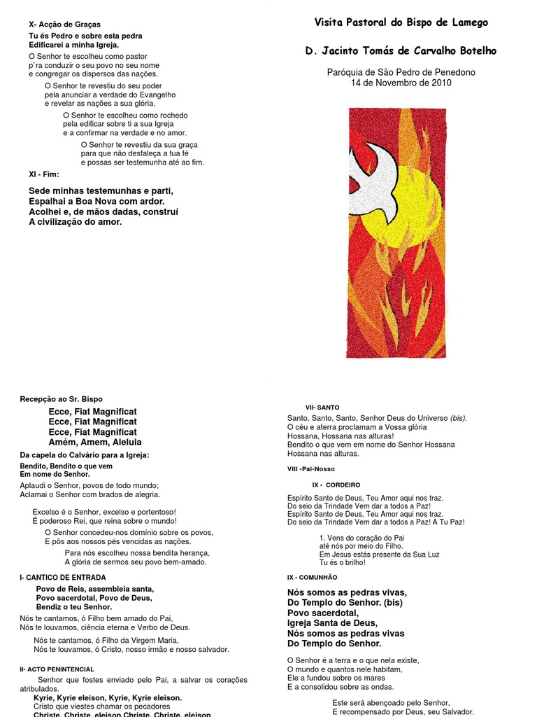 O Senhor te escolheu como pastor p`ra conduzir o seu povo no seu nome e congregar os dispersos das naes. O Senhor te revestiu do seu poder pela anunciar a verdade do Evangelho e revelar as naes a sua glria. O Senhor te escolheu como rochedo pela edificar sobre ti a sua Igreja e a confirmar na verdade e no amor. O Senhor te revestiu da sua graa para que no desfalea a tua f e possas ser testemunha at ao fim. XI - Fim: