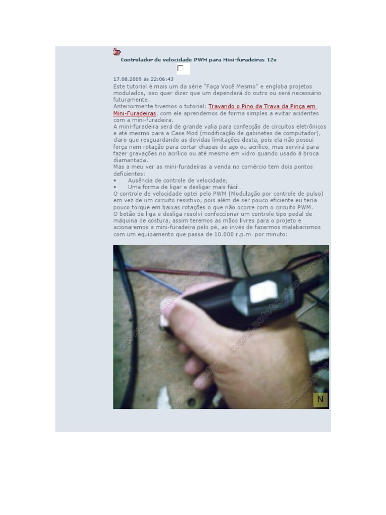 Este tutorial mais um da srie "Faa Voc Mesmo" e engloba projetos modulados, isso quer dizer que um depender do outro ou ser necessrio futuramente. Anteriormente tivemos o tutorial: Travando o Pino da Trava da Pina em Mini-Furadeiras, com ele aprendemos de forma simples a evitar acidentes com a mini-furadeira. A mini-furadeira ser de grande valia para confeco de circuitos eletrnicos e at mesmo para a Case Mod (modificao de gabinetes de computador), claro que resguardando as devidas limitaes desta, pois ela no possui fora nem rotao para cortar chapas de ao ou acrlico, mas servir para fazer gravaes no acrlico ou at mesmo em vidro quando usado broca diamantada. Mas a meu ver as mini-furadeiras a venda no comrcio tem dois pontos deficientes: Ausncia de controle de velocidade; Uma forma de ligar e desligar mais fcil. O controle de velocidade optei pelo PWM (Modulao por controle de pulso) em vez de um circuito resistivo, pois alm de ser pouco eficiente eu teria pouco torque em baixas rotaes o que no ocorre com o circuito PWM. O boto de liga e desliga resolvi confeccionar um controle tipo pedal de mquina de costura, assim teremos as mos livres para o projeto e acionaremos a mini-furadeira pelo p, ao invs de fazermos malabarismos com um equipamento que passa de 10.000 r.p.m. por minuto: