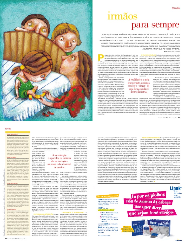 A relAo entre irmos peA fundAmentAl nA nossA construo psquicA e histriA pessoAl. mAs nuncA inteirAmente fcil ou isentA de conflitos, como gostArAmos que fosse. o certo que ApesAr dAs zAngAs, dAs rivAlidAdes e dos cimes criAdos entre irmos desde A mAis tenrA infnciA, os lAos fAmiliAres permAnecem indestrutveis. perdurAm mesmo distnciA e As reAproximAes