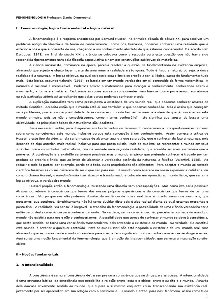 l, na primeira dcada do sculo XX, para resolver um problema antigo da filosofia e da teoria do conhecimento: como ns, humanos, podemos conhecer uma realidade que exterior a ns e que diferente de ns, chegando a um conhecimento absoluto do que estamos conhecendo? De acordo com Dartigues (1973), no final do sculo XIX a cincia se colocava como a resposta para esta questo que no havia sido respondida rigorosamente nem pela filosofia especulativa e nem por construes subjetivas da metafsica. A cincia naturalista, dominante na poca, parecia resolver a questo, se fundamentando na existncia emprica, afirmando que sujeito e objeto fazem parte de uma mesma realidade e so iguais. Tudo fsico e natural, ou seja, a nica realidade a natureza. A lgica objetiva, na qual se baseia esta cincia se prope a ser a lgica, capaz de fundamentar tudo mais. Esta lgica, segundo Valentini (1988), se baseia em um mundo verdadeiro em si, construdo de forma matemtica. A natureza racional e mensurvel. Podemos aplicar a matemtica para alcanar o conhecimento, conhecendo assim o movimento, a forma e a matria. Reduzimos as coisas aos seus componentes mais bsicos (como por exemplo aos tomos ou sub-partculas atmicas) acreditando que pelas partes podemos conhecer o todo. A explicao naturalista tem como pressuposto a existncia de um mundo real, que podemos conhecer atravs do mtodo cientfico. Acredita ento que o mundo est a, ns tambm, e que podemos conhec-lo. Mas assim que comeam seus problemas, pois a prpria possibilidade de se conhecer o mundo tem em si mesma a idia de que j concebemos este mundo primeiro, pois se no o concebssemos, como iramos conhec-lo? objetividade, os princpios bsicos do naturalismo so idealistas. Seria necessrio ento, para chegarmos aos fundamentos verdadeiros do conhecimento, nos questionarmos primeiro sobre como concebemos este mundo, inclusive porque esta concepo um conhecimento. Assim comea a crtica de Husserl a este tipo de cincia: ela seria incapaz de alcanar aquilo a que se prope, que conhecer de fato a natureza, pois depende de algo anterior, mais radical, inclusive para que possa existir. Mais do que isto, ao representar o mundo em seus smbolos, como os smbolos matemticos, cria na verdade uma segunda realidade, que acredita ser mais verdadeira que a primeira. A objetivao e a exatido se tornam possveis mas o mundo emprico que pretende conhecer trocado por um produto da prpria cincia, que ao invs de alcanar a verdadeira essncia da natureza, a falsifica (Valentini, 1988). Ao reduzir o todo s partes, por exemplo, perde-se o todo, cujas propriedades so diferentes. Para adaptar o mundo ao mtodo cientfico fazemos as coisas deixarem de ser o que so para ns. O mundo como aparece na nossa experincia cotidiana, ou como o chama Husserl, o mundo-da-vida (ver abaixo) transformado e colocado em oposio ao mundo fsico, que seria na lgica objetiva, o verdadeiro mundo. Husserl prope ento a fenomenologia, buscando uma filosofia sem pressuposies. Mas como isto seria possvel? Atravs do retorno conscincia que temos das nossas prprias experincias e da conscincia que temos de ter uma conscincia. Isto porque ns no podemos duvidar da evidncia de nossa realidade enquanto seres que existimos, que pensamos, que sentimos. Empiricamente no h como duvidar disto pois algo radical diante do qual estamos presentes e ponto-final. A realidade eu penso inegvel. O trabalho da fenomenologia, a possibilidade de uma cincia verdadeira seria ento partir desta conscincia para conhecer o mundo. Na verdade, sem a conscincia, no perceberamos nada do mundo; o mundo no existiria para ns e no o conheceramos. A possibilidade que temos de conhecer o mundo se deve conscincia, que neste sentido, se torna uma conscincia transcendental pois antecede a existncia do mundo. Na verdade, ela constitui este mundo, anterior a qualquer contedo. Note-se que Husserl no est negando a existncia de um mundo real, mas afirmando que as coisas deste mundo s existem para mim e tem significado porque minha conscincia se dirige a estas. Aqui surge uma noo fundamental da fenomenologia, que a noo de intencionalidade, que permite a integrao sujeitoobjeto. II Noes fundamentais 1. A Intencionalidade A conscincia sempre conscincia de, sempre uma conscincia que se dirige para as coisas. A intencionalidade uma estrutura bsica da conscincia que possibilita a relao entre esta e o objeto, entre o sujeito e o mundo. Atravs dela doamos ativamente sentido ao mundo, que supera a si mesmo enquanto coisa, transcendendo sua existncia real, justamente por ser apreendido em sua relao com a conscincia. O mundo ento, para ns, fenmeno, assim como tudo Isto significa que apesar de buscar uma