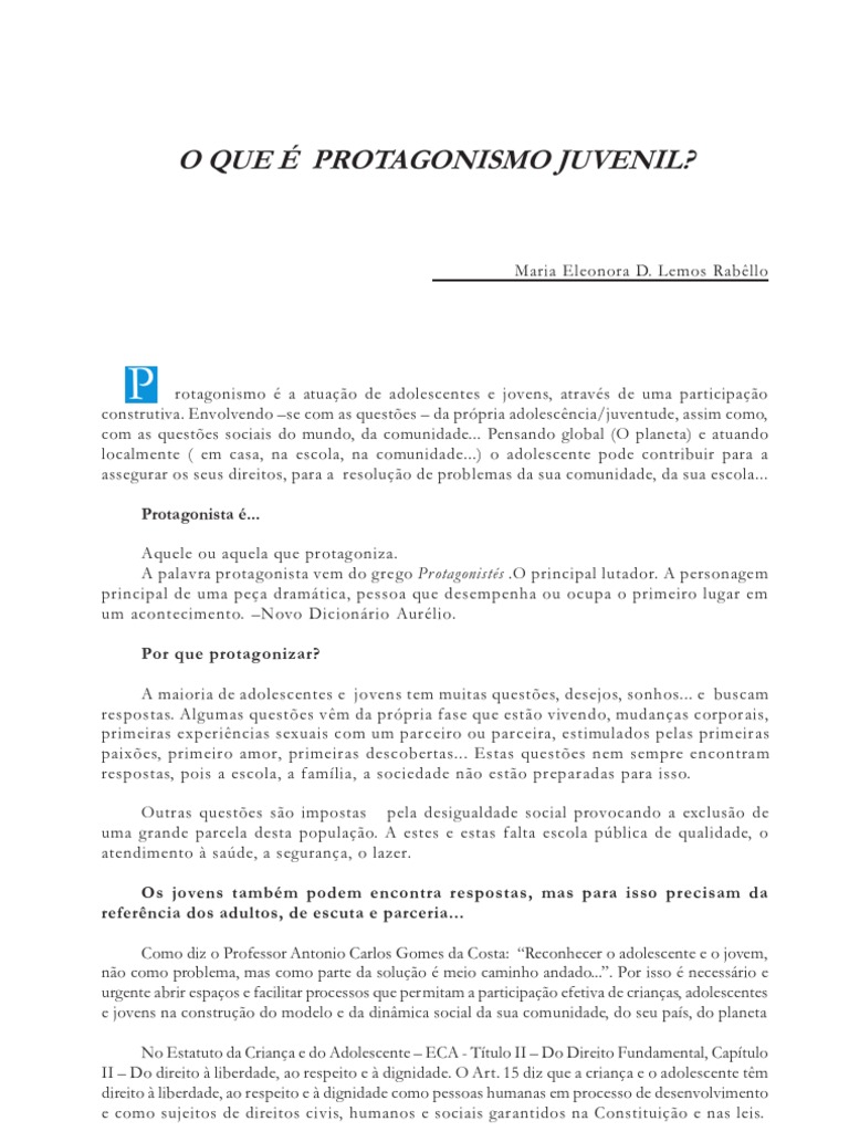 rotagonismo a atuao de adolescentes e jovens, atravs de uma participao construtiva. Envolvendo se com as questes da prpria adolescncia/juventude, assim como, com as questes sociais do mundo, da comunidade... Pensando global (O planeta) e atuando localmente ( em casa, na escola, na comunidade...) o adolescente pode contribuir para a assegurar os seus direitos, para a resoluo de problemas da sua comunidade, da sua escola... Protagonista ... Aquele ou aquela que protag oniza. A palavra protagonista vem do grego Pr otagonists .O principal lutador. A personagem principal de uma pea dramtica, pessoa que desempenha ou ocupa o primeiro lugar em um acontecimento. Novo Dicionrio Aurlio. Por que protagonizar? A maioria de adolescentes e jovens tem muitas questes, desejos, sonhos... e buscam respostas. Algumas questes vm da prpria fase que esto vivendo, mudanas corporais, primeiras experincias sexuais com um parceiro ou parceira, estimulados pelas primeiras paixes, primeiro amor, primeiras descobertas... Estas questes nem sempre encontram respostas, pois a escola, a famlia, a sociedade no esto preparadas para isso. Outras questes so impostas pela desigualdade social provocando a excluso de uma grande parcela desta populao. A estes e estas falta escola pblica de qualidade, o atendimento sade, a segurana, o lazer. Os jovens tambm podem encontra respostas, mas para isso precisam da referncia dos adultos, de escuta e parceria... Como diz o Professor Antonio Carlos Gomes da Costa: Reconhecer o adolescente e o jovem, no como problema, mas como parte da soluo meio caminho andado.... Por isso necessrio e urgente abrir espaos e facilitar processos que permitam a participao efetiva de crianas, adolescentes e jovens na construo do modelo e da dinmica social da sua comunidade, do seu pas, do planeta No Estatuto da Criana e do Adolescente ECA - Ttulo II Do Direito Fundamental, Captulo II Do direito liberdade, ao respeito e dignidade. O Art. 15 diz que a criana e o adolescente tm direito liberdade, ao respeito e dignidade como pessoas humanas em processo de desenvolvimento e como sujeitos de direitos civis, humanos e sociais garantidos na Constituio e nas leis. 1