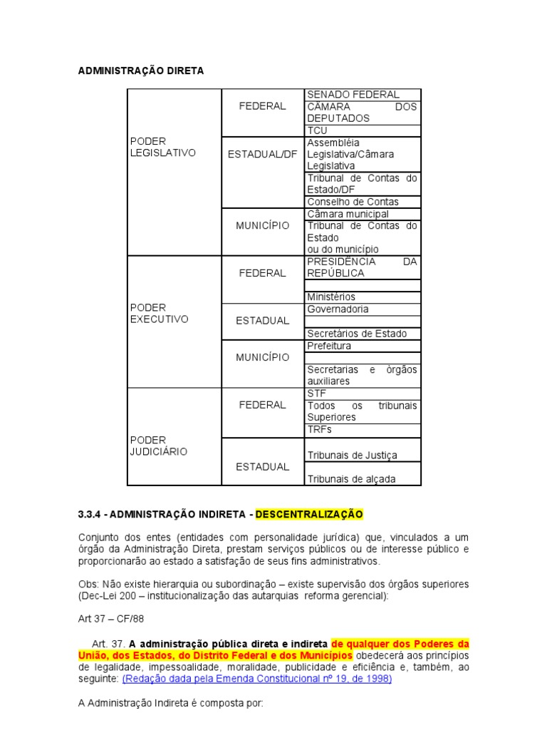 Conselho de Contas Cmara municipal MUNICPIO Tribunal de Contas do Estado ou do municpio PRESIDNCIA DA FEDERAL REPBLICA FEDERAL Ministrios Governadoria ESTADUAL Secretrios de Estado Prefeitura MUNICPIO Secretarias e rgos auxiliares STF Todos os tribunais Superiores TRFs Tribunais de Justia ESTADUAL Tribunais de alada 3.3.4 - ADMINISTRAO INDIRETA - DESCENTRALIZAO Conjunto dos entes (entidades com personalidade jurdica) que, vinculados a um rgo da Administrao Direta, prestam servios pblicos ou de interesse pblico e proporcionaro ao estado a satisfao de seus fins administrativos. Obs: No existe hierarquia ou subordinao existe superviso dos rgos superiores (Dec-Lei 200 institucionalizao das autarquias reforma gerencial): Art 37 CF/88 Art. 37. A administrao pblica direta e indireta de qualquer dos Poderes da Unio, dos Estados, do Distrito Federal e dos Municpios obedecer aos princpios de legalidade, impessoalidade, moralidade, publicidade e eficincia e, tambm, ao seguinte: (Redao dada pela Emenda Constitucional n 19, de 1998) A Administrao Indireta composta por: