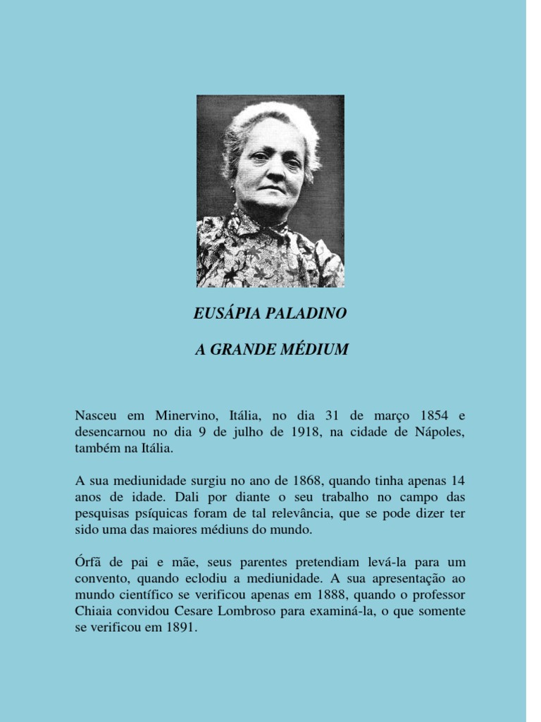 UM ARTIGO A mediunidade de Euspia Palladino marca um perodo luminoso na histria das pesquisas psquicas. Podemos dizer que nenhum mdium, em todo mundo, foi mais duramente examinado do que essa mulher. Euspia, com humildade, submeteu-se aos mais rigorosos exames, para provar a legitimidade dos seus mltiplos dons medinicos. Euspia foi uma mulher simples, ignorante, analfabeta, nascida em Npoles, Itlia, no dia 21 de janeiro de 1854 e desencarnou no ano de 1918, quando contava apenas 64 anos. Suas faculdades medinicas desabrocharam espontaneamente quando era ainda uma menina. Nessa poca j era rf de Pai e Me. Ento foi morar com uma famlia amiga. Na casa desta famlia, foi convidada a participar de trabalhos de ordem espiritual. No fim de dez minutos a mesa em que Euspia se encontrava foi levitada, as cadeiras comearam a danar, as cortinas da sala foram puxadas, os copos e as garrafas bailavam no ar. Todas essas levitaes e movimentaes sem quaisquer contactos humanos. As pessoas que pela primeira vez participaram daquele trabalho com a presena de Euspia, no sabiam que aludidos fenmenos eram produzidos pela sua fora medinica. Os Espritos valiam-se da ectoplasmia da mdium para aludidas manifestaes de ordem fsica. Posteriormente, contou com a orientao do professor Damiani e com ele aprimorou sua mediunidade. Tornou-se uma mdium magnfica. Possua todos os dons medinicos, especificamente o dom medinico de efeitos fsicos. Como mdium, passou pelo crivo de eminentes homens de Cincia. Inmeros Cientistas que a