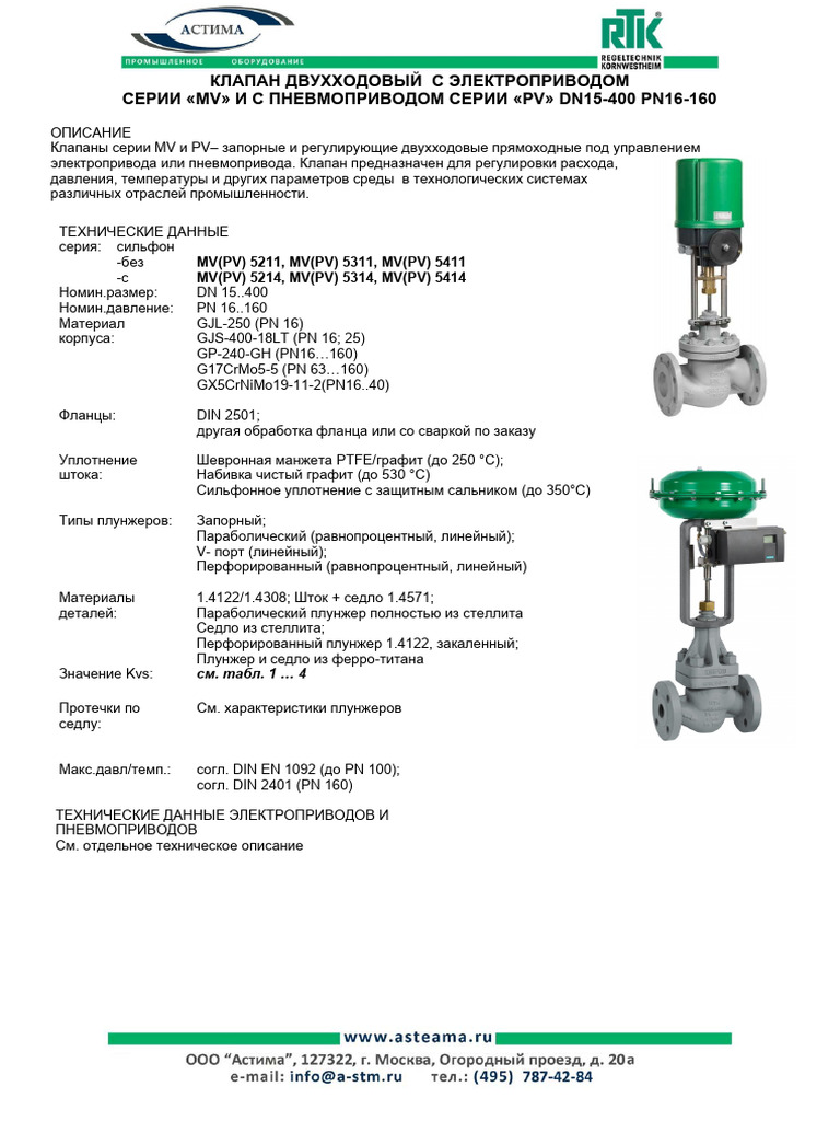 Клапаны серии MV и PV– запорные и регулирующие двухходовые прямоходные под управлением
