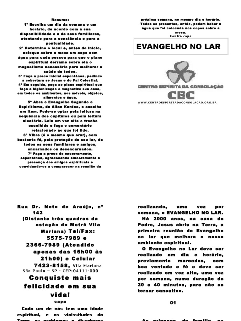 realizando, uma vez por semana, o EVANGELHO NO LAR. H 2000 anos, na casa de Pedro, Jesus abriu na Terra, a primeira reunio do Evangelho no lar que melhora o nosso ambiente espiritual. O Evangelho no Lar deve ser realizado em dia e horrio, previamente marcados, com boa vontade e f e deve ser realizado em voz alta, uma vez por semana, numa durao de 20 a 40 minutos, para no se tornar cansativo. 01