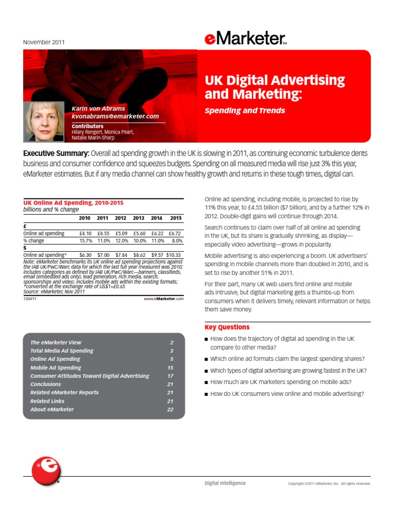 Executive Summary: Overall ad spending growth in the UK is slowing in 2011, as continuing economic turbulence dents business and consumer confidence and squeezes budgets. Spending on all measured media will rise just 3% this year, eMarketer estimates. But if any media channel can show healthy growth and returns in these tough times, digital can.