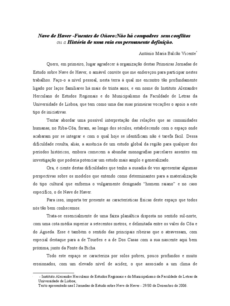 Quero, em primeiro, lugar agradecer organizao destas Primeiras Jornadas de Estudo sobre Nave de Haver, o amvel convite que me endereou para participar nestes trabalhos. Fao-o a nvel pessoal, nesta terra qual me encontro to profundamente ligado por laos familiares h mais de trinta anos, e em nome do Instituto Alexandre Herculano de Estudos Regionais e do Municipalismo da Faculdade de Letras da Universidade de Lisboa, que tem como uma das suas primeiras vocaes o apoio a este tipo de iniciativas. Tentar abordar uma possvel interpretao das relaes que as comunidades humanas, no Riba-Ca, foram, ao longo dos sculos, estabelecendo com o espao onde acabaram por se integrar e com o qual hoje se identificam no tarefa fcil. Dessa dificuldade resulta, alis, a ausncia de um estudo global da regio para qualquer dos perodos histricos, embora comecem a abundar monografias parcelares assentes em investigao que poderia potenciar um estudo mais amplo e generalizado. Ora, ciente destas dificuldades que tenho a ousadia de vos apresentar algumas perspectivas sobre os modelos que entendo como determinantes para a materializao do tipo cultural que enforma o vulgarmente designado homem raiano e no caso especfico, o de Nave de Haver. Para isso, importa ter presente as caractersticas fsicas deste espao que todos ns to bem conhecemos. Trata-se essencialmente de uma faixa planltica disposta no sentido sul-norte, com uma cota mdia superior a setecentos metros, e delimitada entre os vales do Ca e do gueda. Esse tambm o sentido das principais ribeiras que o atravessam, com especial destaque para a de Toures e a de Dos Casas com a sua nascente aqui bem prxima, junto da Fonte da Bicha. Todo este espao se caracteriza por solos pobres, pouco profundos e muito erosionados, com um elevado nvel de acidez, o que associado a um clima de