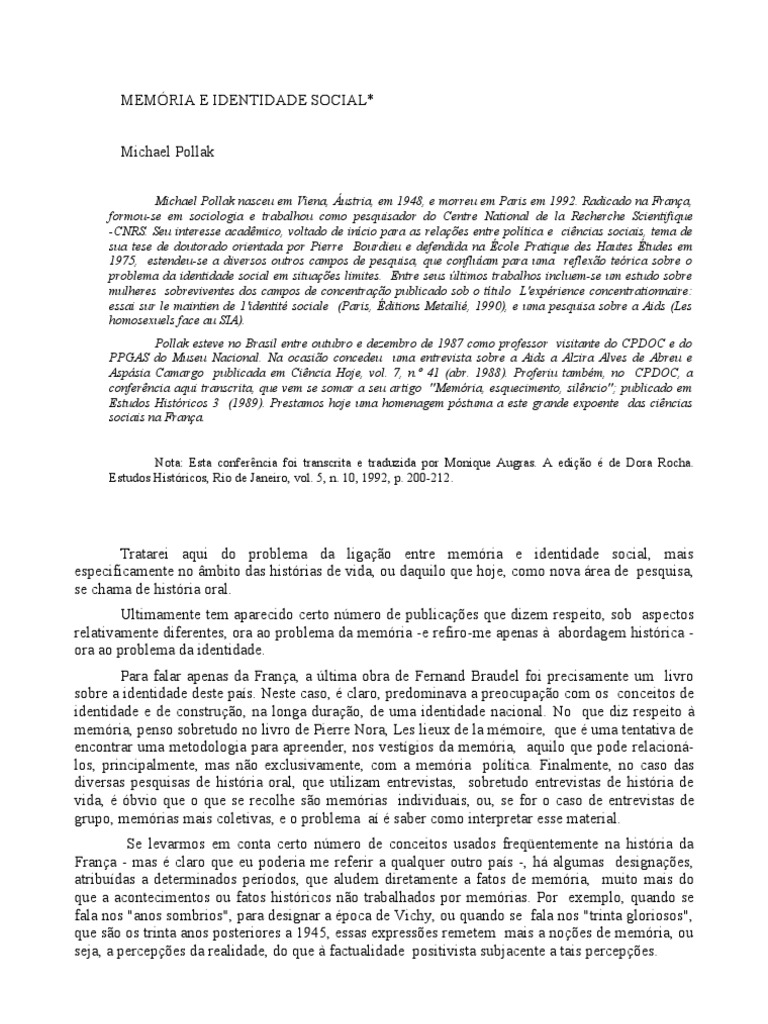 Michael Pollak nasceu em Viena, ustria, em 1948, e morreu em Paris em 1992. Radicado na Frana, formou-se em sociologia e trabalhou como pesquisador do Centre National de la Recherche Scientifique -CNRS. Seu interesse acadmico, voltado de incio para as relaes entre poltica e cincias sociais, tema de sua tese de doutorado orientada por Pierre Bourdieu e defendida na cole Pratique des Hautes tudes em 1975, estendeu-se a diversos outros campos de pesquisa, que confluam para uma reflexo terica sobre o problema da identidade social em situaes limites. Entre seus ltimos trabalhos incluem-se um estudo sobre mulheres sobreviventes dos campos de concentrao publicado sob o ttulo L'exprience concentrationnaire: essai sur le maintien de 1'identit sociale (Paris, ditions Metaili, 1990), e uma pesquisa sobre a Aids (Les homosexuels face au SIA). Pollak esteve no Brasil entre outubro e dezembro de 1987 como professor visitante do CPDOC e do PPGAS do Museu Nacional. Na ocasio concedeu uma entrevista sobre a Aids a Alzira Alves de Abreu e Aspsia Camargo publicada em Cincia Hoje, vol. 7, n. 41 (abr. 1988). Proferiu tambm, no CPDOC, a conferncia aqui transcrita, que vem se somar a seu artigo "Memria, esquecimento, silncio"; publicado em Estudos Histricos 3 (1989). Prestamos hoje uma homenagem pstuma a este grande expoente das cincias sociais na Frana. Nota: Esta conferncia foi transcrita e traduzida por Monique Augras. A edio de Dora Rocha. Estudos Histricos, Rio de Janeiro, vol. 5, n. 10, 1992, p. 200-212.