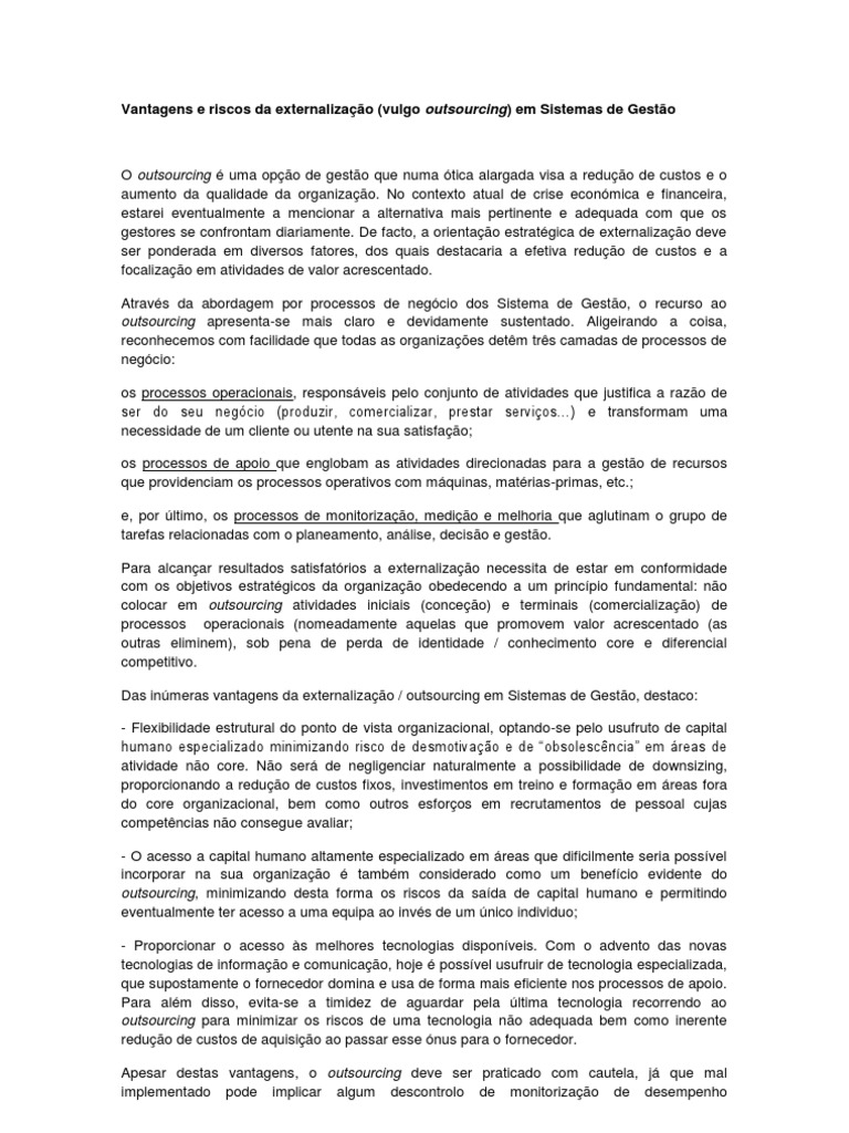 O outsourcing uma opo de gesto que numa tica alargada visa a reduo de custos e o aumento da qualidade da organizao. No contexto atual de crise econmica e financeira, estarei eventualmente a mencionar a alternativa mais pertinente e adequada com que os gestores se confrontam diariamente. De facto, a orientao estratgica de externalizao deve ser ponderada em diversos fatores, dos quais destacaria a efetiva reduo de custos e a focalizao em atividades de valor acrescentado. Atravs da abordagem por processos de negcio dos Sistema de Gesto, o recurso ao outsourcing apresenta-se mais claro e devidamente sustentado. Aligeirando a coisa, reconhecemos com facilidade que todas as organizaes detm trs camadas de processos de negcio: os processos operacionais, responsveis pelo conjunto de atividades que justifica a razo de ser do seu negcio (produzir, comercializar, prestar servios) e transformam uma necessidade de um cliente ou utente na sua satisfao; os processos de apoio que englobam as atividades direcionadas para a gesto de recursos que providenciam os processos operativos com mquinas, matrias-primas, etc.; e, por ltimo, os processos de monitorizao, medio e melhoria que aglutinam o grupo de tarefas relacionadas com o planeamento, anlise, deciso e gesto. Para alcanar resultados satisfatrios a externalizao necessita de estar em conformidade com os objetivos estratgicos da organizao obedecendo a um princpio fundamental: no colocar em outsourcing atividades iniciais (conceo) e terminais (comercializao) de processos operacionais (nomeadamente aquelas que promovem valor acrescentado (as outras eliminem), sob pena de perda de identidade / conhecimento core e diferencial competitivo. Das inmeras vantagens da externalizao / outsourcing em Sistemas de Gesto, destaco: - Flexibilidade estrutural do ponto de vista organizacional, optando-se pelo usufruto de capital humano especializado minimizando risco de desmotivao e de obsolescncia em reas de atividade no core. No ser de negligenciar naturalmente a possibilidade de downsizing, proporcionando a reduo de custos fixos, investimentos em treino e formao em reas fora do core organizacional, bem como outros esforos em recrutamentos de pessoal cujas competncias no consegue avaliar; - O acesso a capital humano altamente especializado em reas que dificilmente seria possvel incorporar na sua organizao tambm considerado como um benefcio evidente do outsourcing, minimizando desta forma os riscos da sada de capital humano e permitindo eventualmente ter acesso a uma equipa ao invs de um nico individuo; - Proporcionar o acesso s melhores tecnologias disponveis. Com o advento das novas tecnologias de informao e comunicao, hoje possvel usufruir de tecnologia especializada, que supostamente o fornecedor domina e usa de forma mais eficiente nos processos de apoio. Para alm disso, evita-se a timidez de aguardar pela ltima tecnologia recorrendo ao outsourcing para minimizar os riscos de uma tecnologia no adequada bem como inerente reduo de custos de aquisio ao passar esse nus para o fornecedor. Apesar destas vantagens, o outsourcing deve ser praticado com cautela, j que mal implementado pode implicar algum descontrolo de monitorizao de desempenho