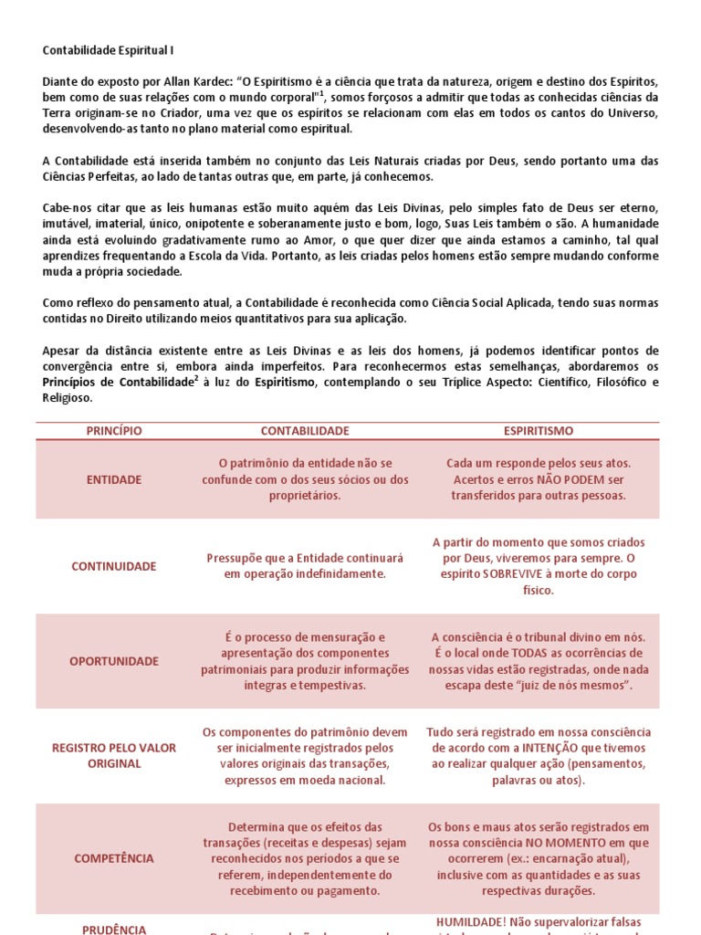 s Espritos, bem como de suas relaes com o mundo corporal"1, somos forosos a admitir que todas as conhecidas cincias da Terra originam-se no Criador, uma vez que os espritos se relacionam com elas em todos os cantos do Universo, desenvolvendo-as tanto no plano material como espiritual. A Contabilidade est inserida tambm no conjunto das Leis Naturais criadas por Deus, sendo portanto uma das Cincias Perfeitas, ao lado de tantas outras que, em parte, j conhecemos. Cabe-nos citar que as leis humanas esto muito aqum das Leis Divinas, pelo simples fato de Deus ser eterno, imutvel, imaterial, nico, onipotente e soberanamente justo e bom, logo, Suas Leis tambm o so. A humanidade ainda est evoluindo gradativamente rumo ao Amor, o que quer dizer que ainda estamos a caminho, tal qual aprendizes frequentando a Escola da Vida. Portanto, as leis criadas pelos homens esto sempre mudando conforme muda a prpria sociedade. Como reflexo do pensamento atual, a Contabilidade reconhecida como Cincia Social Aplicada, tendo suas normas contidas no Direito utilizando meios quantitativos para sua aplicao. Apesar da distncia existente entre as Leis Divinas e as leis dos homens, j podemos identificar pontos de convergncia entre si, embora ainda imperfeitos. Para reconhecermos estas semelhanas, abordaremos os Princpios de Contabilidade2 luz do Espiritismo, contemplando o seu Trplice Aspecto: Cientfico, Filosfico e Religioso. PRINCPIO CONTABILIDADE O patrimnio da entidade no se confunde com o dos seus scios ou dos proprietrios. ESPIRITISMO Cada um responde pelos seus atos. Acertos e erros NO PODEM ser transferidos para outras pessoas.