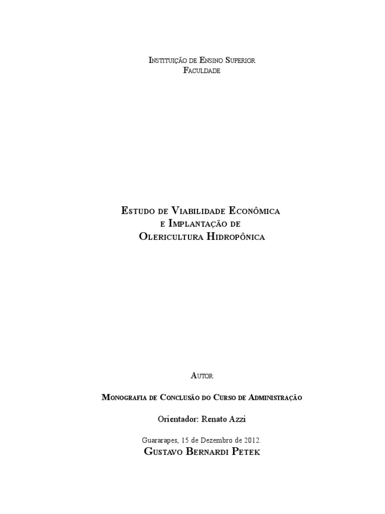 Autoria: Gustavo Bernardi Petek. Ttulo: Estudo de Viabilidade Econmica e Implantao de Olericultura Hidropnica. Trabalho de concluso de curso apresentado como parte das atividades para obteno do ttulo de bacharel do curso de Administrao da Faculdade de Guararapes, UNIESP.