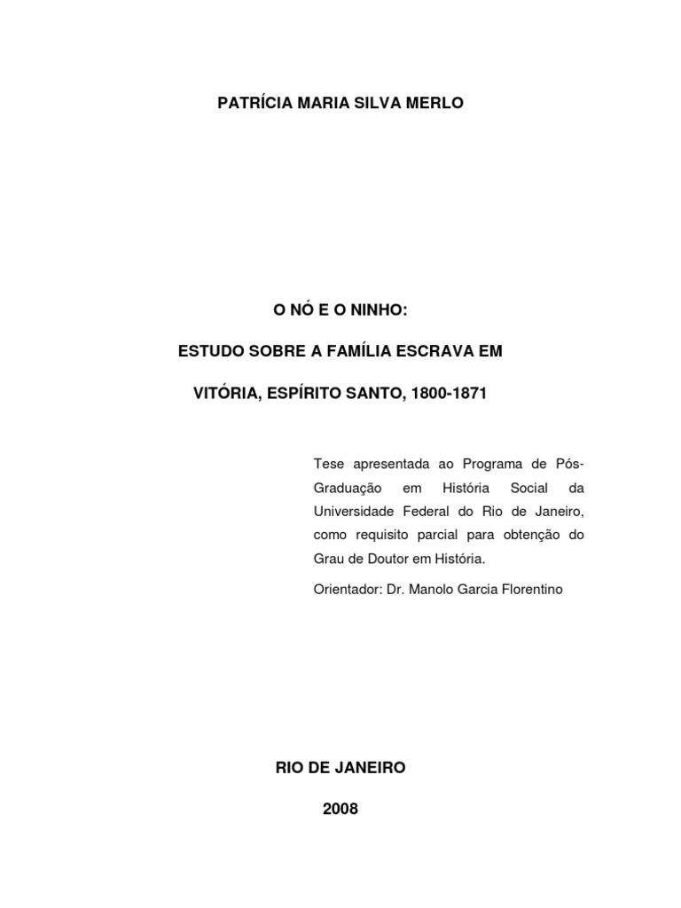 Inicialmente, agradeço a meu orientador, Prof. Dr. Manolo Florentino, cujos textos me inspiraram desde a graduação. Dono de uma faculdade rara, seus trabalhos permitem trazer ao presente homens de outros tempos. Sua escrita é cheia de vida, por isso a palavra, nele, torna-se inspiração. Agradeço-lhe pela oportunidade de um aprendizado singular. À Adriana, primeiro mestre, há tempos amiga, não tenho palavras para retribuir a paciência, o incentivo e a colaboração. Quanto às tardes infindáveis de arquivo, o justo agradecimento a Rosani, Agostinho e Tayrone. Fabíola, a você também obrigada. Também à Lívia, amiga de mestrado, obrigada por atender meus numerosos telefonemas afoitos, em especial, nos domingos à noite. É justo igualmente agradecer aos alunos e colegas de trabalho com os quais convivi ao longo destes anos de tese e com quem pude discutir de diferentes formas minhas dúvidas e descobertas. E por falar em descobertas, meu especial agradecimento ao Babalorixá Jorge de Oxósse e sua casa que muito me ensinaram sobre as sobrevivências africanas no Brasil. Menção é imperativa ao Programa de Pós- graduação da UFRJ, que me acolheu e estimulou em minha jornada de doutorado, bem como ao CNPq pela concessão da bolsa de pesquisa.