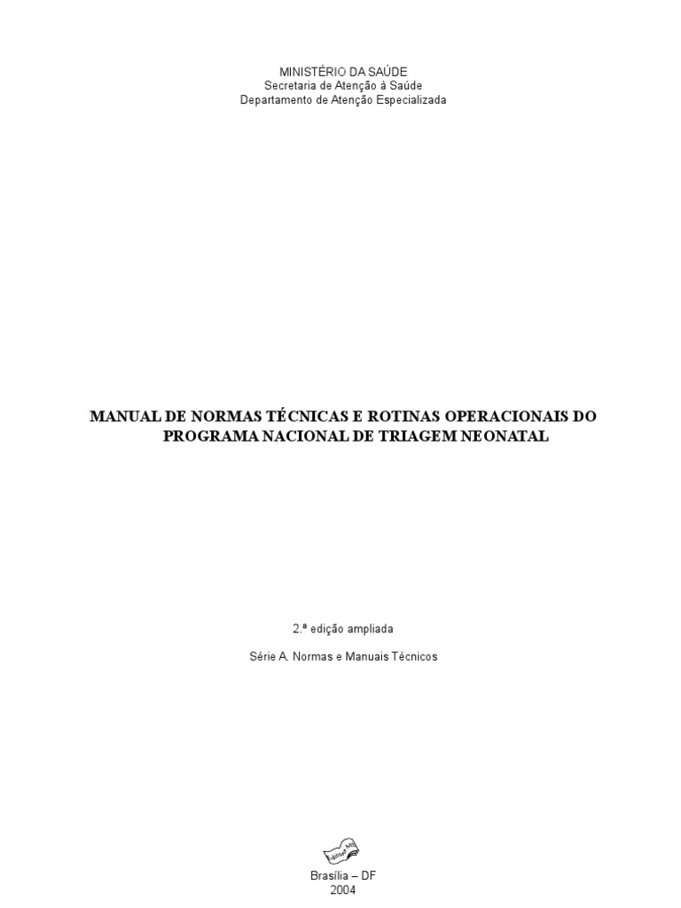 Brasil. Ministério da Saúde. Secretaria de Atenção à Saúde. Departamento de Atenção Especializada. Manual de normas técnicas e rotinas operacionais do programa nacional de triagem neonatal / Ministério da Saúde, Secretaria de Atenção à Saúde, Departamento de Atenção Especializada. – 2. ed. ampl. – Brasília: