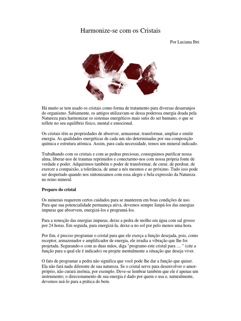 H muito se tem usado os cristais como forma de tratamento para diversas desarranjos do organismo. Sabiamente, os antigos utilizavam-se dessa poderosa energia doada pela Natureza para harmonizar os sistemas energticos mais sutis do ser humano, o que se reflete no seu equilbrio fsico, mental e emocional. Os cristais tm as propriedades de absorver, armazenar, transformar, ampliar e emitir energia. As qualidades energticas de cada um so determinadas por sua composio qumica e estrutura atmica. Assim, para cada necessidade, temos um mineral indicado. Trabalhando com os cristais e com as pedras preciosas, conseguimos purificar nossa alma, liberar-nos de traumas reprimidos e conectarmo-nos com nossa prpria fonte de verdade e poder. Adquirimos tambm o poder de transformar, de curar, de perdoar, de exercer a compaixo, a tolerncia, de amar a ns mesmos e ao prximo. Tudo isso pode ser despertado quando nos sintonizamos com essa alegre e bela expresso da Natureza no reino mineral. Preparo do cristal Os minerais requerem certos cuidados para se manterem em boas condies de uso. Para que sua potencialidade permanea ativa, devemos sempre limp-los das energias impuras que absorvem, energiz-los e program-los. Para a remoo das energias impuras, deixe a pedra de molho em gua com sal grosso por 24 horas. Em seguida, para energiz-la, deixe-a no sol por pelo menos uma hora. Por fim, preciso programar o cristal para que ele exera a funo desejada, pois, como receptor, armazenador e amplificador de energia, ele irradia a vibrao que lhe foi projetada. Segurando-o com as duas mos, diga "programo este cristal para .... " (cite a funo para a qual ele indicado) ou projete mentalmente a situao que deseja viver. O fato de programar a pedra no significa que voc pode lhe dar a funo que quiser. Ela no far nada diferente de sua natureza. Se o cristal serve para desenvolver o amorprprio, no curar insnia, por exemplo. Deve-se lembrar tambm que ele apenas um instrumento; o direcionamento de sua energia dado por quem o usa e, naturalmente, devemos us-lo para a prtica do bem.