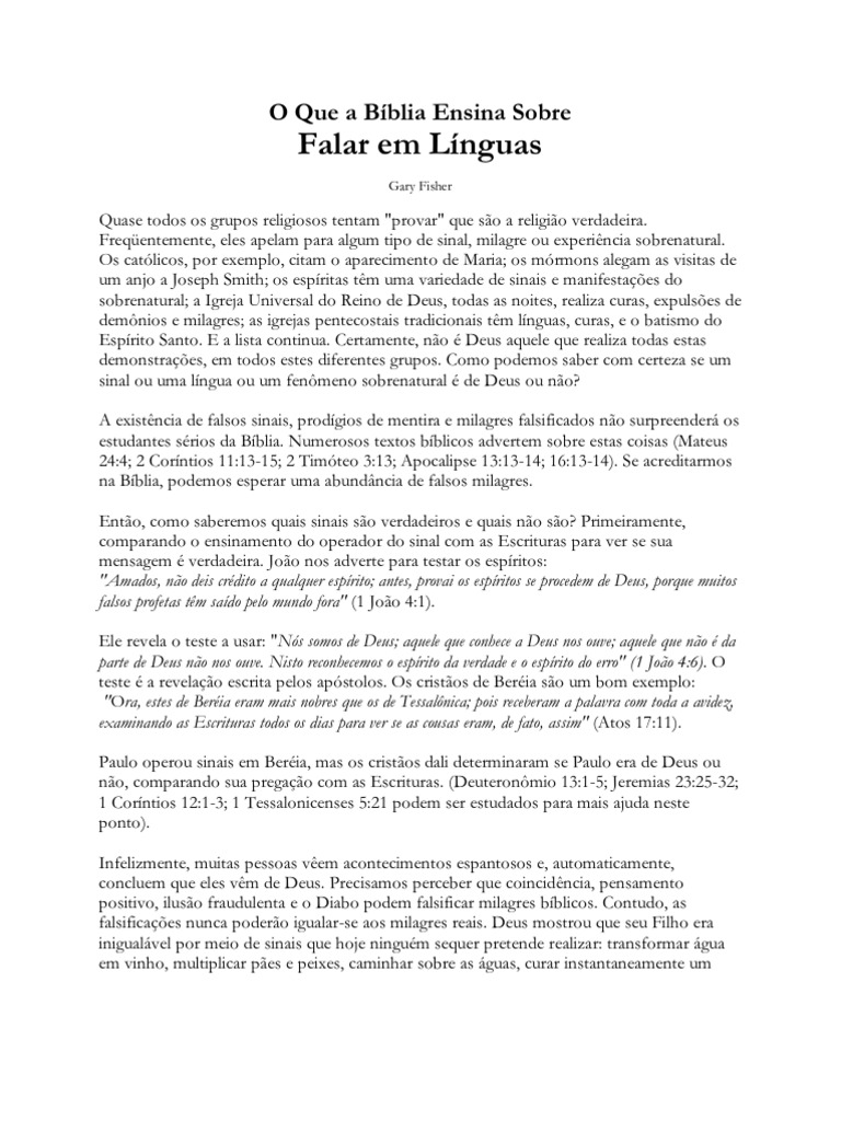 Muitos catlicos falam lnguas nas igrejas catlicas carismticas. Estaria o Esprito Santo dando seu sinal de aprovao a igrejas que pregam coisas que contradizem completamente umas s outras? Muitas das doutrinas e prticas destas igrejas no s contradizem umas s outras, mas contradizem tambm a Bblia. _______________________________________________ poca Finalmente, porm talvez o mais importante, a Bblia especificamente ensina que as lnguas deveriam continuar somente durante aquela poca. Note cuidadosamente 1 Corntios 13:813. No versculo 8, Paulo disse que as lnguas cessariam: "havendo lnguas, cessaro". No versculo 10 ele mostra quando: Quando vier o que perfeito. Isto est intensamente claro. As lnguas eram para durar somente at que o perfeito viesse. A dificuldade est em determinar a que o "perfeito" se refere. Em geral, muitas coisas poderiam ser perfeitas (completas). Poderamos ter uma casa perfeita, um carro perfeito ou, talvez, uma completa e perfeita pizza. Perfeito uma qualidade que pode ser (e assim est na Bblia) usada para qualificar muitas coisas. Desta maneira, h um contraste entre o que "em parte" e o que "o perfeito". Em qualquer rea, o perfeito sempre a soma das partes. Assim, se sabemos quais eram as partes, podemos junt-las e encontrar o perfeito. As partes eram o conhecimento e a revelao (profecia) da vontade de Deus. Naquele tempo, a revelao de Deus estava se fazendo conhecida justamente uma parte de cada vez. A prpria primeira carta aos Corntios era uma dessas partes. Se as partes, ento, se referem revelao da Palavra de Deus, parte por parte, o perfeito tem que ser a revelao completa de Deus, o Novo Testmento. Portanto, quando o Novo Testamento se completou, o dom das lnguas cessou, de acordo com o plano de Deus. O que vai acontecer? "Lnguas cessaro" Quando? "Quando vier o que perfeito" O que perfeito? A soma das partes O que so partes? Revelao da palavra em partes O que o perfeito? A revelao completa a Bblia Quando a revelao foi completada, as lnguas bblicas cessaram O resto do captulo 13 confirma este entendimento. No versculo 11, Paulo mostra que normal a diferena entre o falar e o pensar de uma criana e o de um adulto. "Quando eu era menino, falava como menino, sentia como menino, pensava como menino; quando cheguei a ser homem, desisti das cousas prprias de menino" (1 Corntios 13:11). Igualmente, normal a diferena entre a infncia e a idade adulta da igreja. Deus usou os traos da infncia (lnguas, profecia, etc.) para revelar sua Palavra, originalmente. Mas, agora que a maturidade foi atingida, no usamos mais o falar de uma criana. Isto muito semelhante construo de um edifcio. No processo de construo, o escoramento usado; mas, sempre que a construo completada, o escoramento removido. No versculo 12, Paulo descreve o tempo quando o evangelho estava sendo revelado pea por pea, como vendo em um espelho vagamente ou conhecendo em parte: