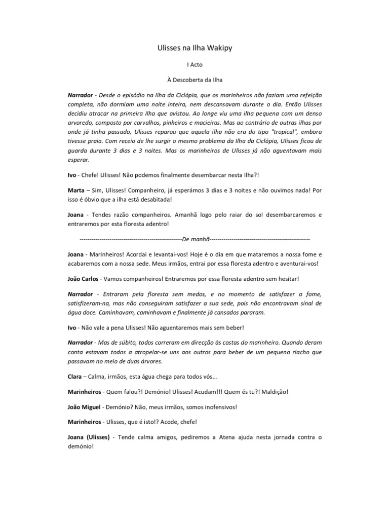 I Acto Descoberta da Ilha Narrador - Desde o episdio na Ilha da Ciclpia, que os marinheiros no faziam uma refeio completa, no dormiam uma noite inteira, nem descansavam durante o dia. Ento Ulisses decidiu atracar na primeira Ilha que avistou. Ao longe viu uma ilha pequena com um denso arvoredo, composto por carvalhos, pinheiros e macieiras. Mas ao contrrio de outras ilhas por onde j tinha passado, Ulisses reparou que aquela ilha no era do tipo "tropical", embora tivesse praia. Com receio de lhe surgir o mesmo problema da Ilha da Ciclpia, Ulisses ficou de guarda durante 3 dias e 3 noites. Mas os marinheiros de Ulisses j no aguentavam mais esperar. Ivo - Chefe! Ulisses! No podemos finalmente desembarcar nesta Ilha?! Marta Sim, Ulisses! Companheiro, j espermos 3 dias e 3 noites e no ouvimos nada! Por isso bvio que a ilha est desabitada! Joana - Tendes razo companheiros. Amanh logo pelo raiar do sol desembarcaremos e entraremos por esta floresta adentro! ---------------------------------------------------De manh-------------------------------------------------Joana - Marinheiros! Acordai e levantai-vos! Hoje o dia em que mataremos a nossa fome e acabaremos com a nossa sede. Meus irmos, entrai por essa floresta adentro e aventurai-vos! Joo Carlos - Vamos companheiros! Entraremos por essa floresta adentro sem hesitar! Narrador - Entraram pela floresta sem medos, e no momento de satisfazer a fome, satisfizeram-na, mas no conseguiram satisfazer a sua sede, pois no encontravam sinal de gua doce. Caminhavam, caminhavam e finalmente j cansados pararam. Ivo - No vale a pena Ulisses! No aguentaremos mais sem beber! Narrador - Mas de sbito, todos correram em direco s costas do marinheiro. Quando deram conta estavam todos a atropelar-se uns aos outros para beber de um pequeno riacho que passavam no meio de duas rvores. Clara Calma, irmos, esta gua chega para todos vs... Marinheiros - Quem falou?! Demnio! Ulisses! Acudam!!! Quem s tu?! Maldio! Joo Miguel - Demnio? No, meus irmos, somos inofensivos! Marinheiros - Ulisses, que isto!? Acode, chefe! Joana (Ulisses) - Tende calma amigos, pediremos a Atena ajuda nesta jornada contra o demnio!