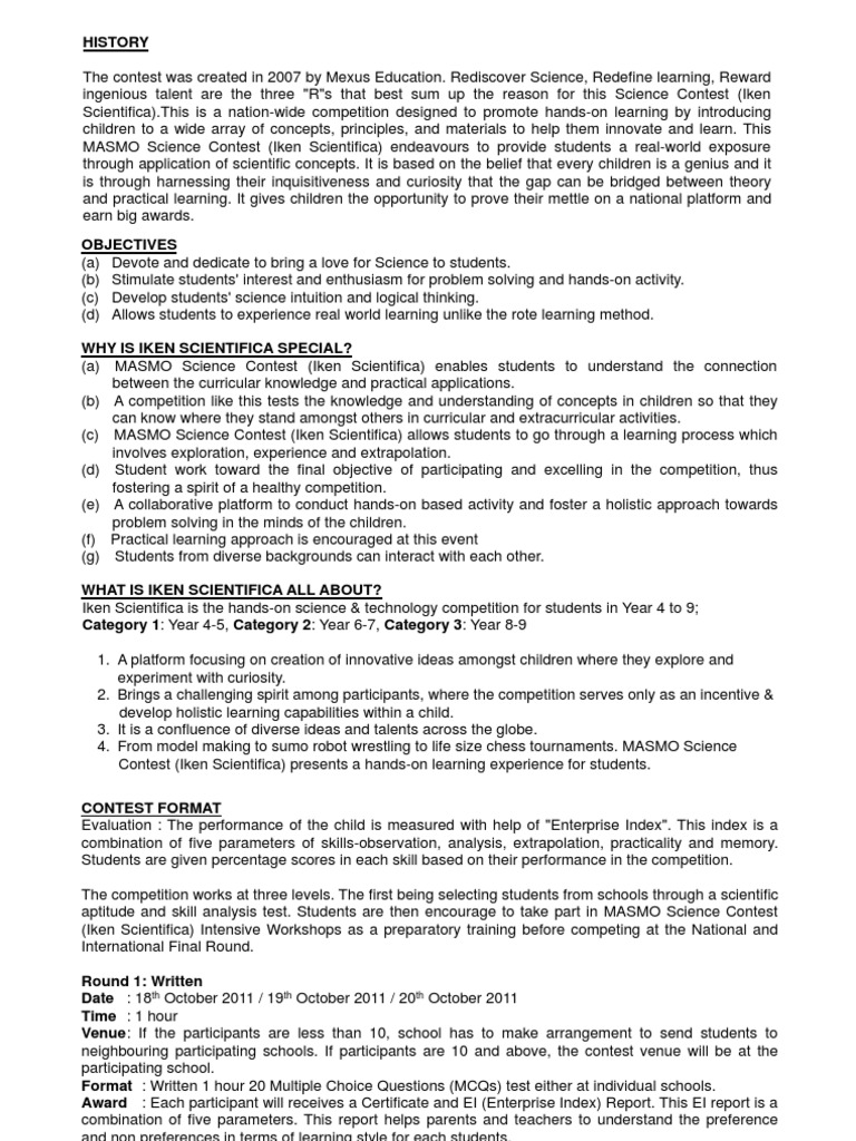 Imagine a platform where you can experiment hands-on and innovate on scientific concepts and compete with the best of talent at a global level. MASMO Science Contest MASMO (Iken Science Scie ntifica), Contest the (IKEN largest SCIENTIFICA) hands-on science and technology competition, is one such platform that presents young minds th e opportunity of testing out scientific concepts and theories learnt in school and applying them in the real world. The goal of this competition is simple, to help students appreciate and enjoy science. It is based on the philosophy that every child is a born genius and Iken Scientifica is an effort to help them develop their skills to create, shar pen their abilities to compete, shape their personality to excel and make them success confident.