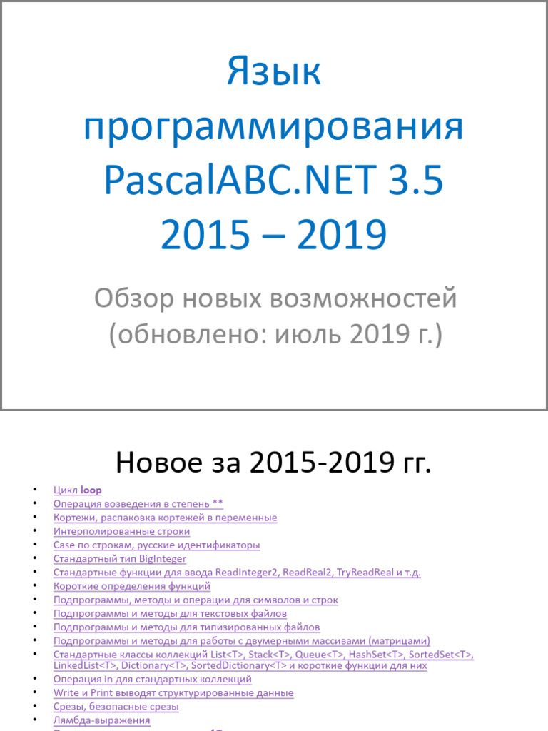 • PascalABC.NET 2015-2019 меняет стиль решения ряда задач. Код становится более