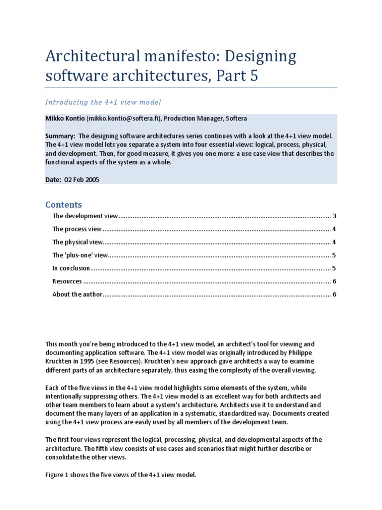 Resources offers more links where you can learn about the 4+1 view model, as well as other architectural views. In next month's Architectural manifesto I will discuss the evaluation of architecture prototypes.