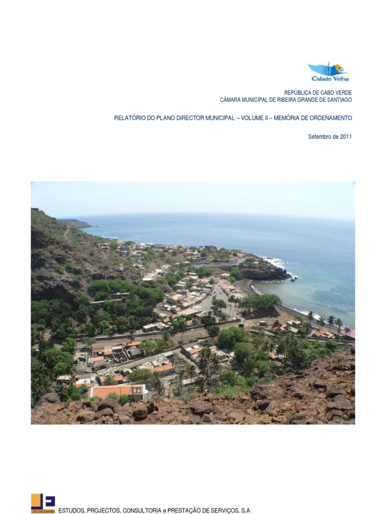 A proposta de ordenamento delineada para o municpio da Ribeira Grande, cujo Stio Histrico foi reconhecido pela U.N.E.S.C.O como Patrimnio da Humanidade, objectiva redefinir as formas de estruturao e ocupao do solo, salvaguardando os recursos ambientais, paisagsticos, culturais e patrimoniais, criando espaos coerentes e estveis integrados nas reas de proteco e enquadramento ambientais. O modelo de ordenamento proposto revela-se de extrema importncia num municpio onde notria a deficincia em termo da rede de infra-estruturas e equipamentos sociais e colectivos. O progressivo abandono e deslocamento das pessoas das zonas rurais em detrimento das urbanas, tem causado a aglomerao da populao nas localidades em torno do centro, em pssimas condies de habitabilidade e a desertificao das zonas rurais. Verifica-se a necessidade de disciplinar com enorme sensatez o regime de edificabilidade face importante estrutura paisagstica e ao esplio patrimonial existente, dando nfase a um objectivo maior, conciliar o desenvolvimento com a necessidade de preservao do patrimnio cultural e natural, de forma a tornar Ribeira Grande de Santiago num municpio competitivo a nvel nacional e internacional. O sistema de ordenamento proposto feito de acordo com as Condicionantes identificadas na Planta de Condicionantes e nas Classes de Espaos, delimitadas na Planta de Ordenamento, nomeadamente: Classes Canais e Equipamentos, reas Edificveis e reas No Edificveis. Os contedos do Relatrio foram estruturados e definidos de modo a responder as exigncias legais requeridas nos termos do Decreto-lei n 1/2006 de 13 de Fevereiro 1, bem como as questes que so de ordem especfica do municpio da Ribeira Grande de Santiago e do contexto urbanstico, econmico e social em que este se insere. O PDM constitudo por 3 volumes: Volume I Caracterizao e Diagnstico, estabelece o enquadramento, a anlise e o diagnstico sectorial, apresentando os elementos fundamentais de localizao geogrfica e de enquadramento no sistema de gesto territorial, a caracterizao da dinmica social e econmica que se desenvolve e se perspectiva nos prximos 12 anos para a Ribeira Grande de Santiago, permitindo um melhor ajustamento do plano incerteza associada a estas intervenes e ao novo ciclo de crescimento econmico a que se assiste, sobretudo no sector agrcola, industrial e comercial;