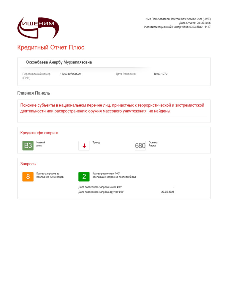 Информация в кредитном отчете сформирована на основе сведений, поступивших в базу данных КБ Ишеним от поставщиков кредитной информации и действительна