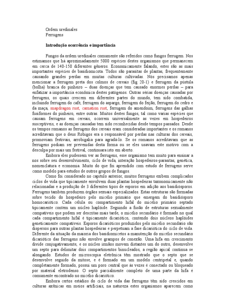 Nos estimamos que h aproximadamente 5000 espcies destes organismos que permanecem em cerca de 140-150 diferentes gneros. Economicamente falando, estes so as mais importantes espcies de basidiomicota. Todos so parasitas de plantas, frequentemente causando grandes perdas em muitas culturas cultivadas. Ns precisamos apenas mencionar a ferrugem preta dos colmos de cereais (fig 20-1) e ferrugem da pstula (bolha) branca do pinheiro duas doenas que tem causado enormes perdas para enfatizar a importncia econmica destes patgenos. Outras srias doenas causadas por ferrugens, os quais crescem em diferentes partes do mundo, tem sido combatida, incluindo ferrugem do caf, ferrugem do aspargo, ferrugem do feijo, ferrugem do cedro e da maa, snapdragon rust, carnation rust, ferrugem do amendoim, ferrugens das galhas fusiformes do pinheiro, entre outras. Muitos destes fungos, tal como varias espcies que causam ferrugens em cereais, ocorrem universalmente as vezes em hospedeiros susceptveis, e as doenas causadas tem sido reconhecidas desde tempos passados. Desde os tempos romanos as ferrugens dos cereais eram consideradas importantes e os romanos acreditavam que o deus Robigos era o responsvel por perdas nas culturas dos cereais, promoviam festivais, arrobigalia para agrad-lo. Se os romanos acreditavam que as ferrugens podiam ser prevenidas desta forma ou se eles usavam este motivo com a desculpa por mais um festival, continuara isto em aberto. Embora eles pudessem ver as ferrugens, esse organismo tem muito para ensinar a nos sobre seu desenvolvimento, ciclo de vida, interao hospedeiros-parasitas, gentica, nomenclatura e economia. Muito do que foi aprendido com estudo de ferrugens serve como modelo para estudos de outros grupos de fungos. Como foi considerado no capitulo anterior, muitos ferrugens exibem complicados ciclos de vida que tipicamente envolvem duas plantas hospedeiras taxonomicamente no relacionadas e a produo de 3 diferentes tipos de esporos em adio aos basidisporos. Ferrugens tambm produzem rgos sexuais especializados. Estas estruturas so formadas sobre tecido do hospedeiro pelo miclio primrio que emergem do basidisporo homocaritico. Cada clula ou compartimento hifal do miclio primrio septado tipicamente contm um ncleo haplide. Seguindo a fuso de estruturas sexualmente compatveis que podem ser descritas mais tarde, o miclio secundrio formado no qual cada compartimento hifal tipicamente dicaritico, contendo dois ncleos haplides geneticamente compatveis. Esporos dicariticos produzidos pelo miclio secundrio so dispersos para outras plantas hospedeiras e perpetuam a fase dicaritica do ciclo de vida. Diferente da situao da maioria dos basidiomicetos a manuteno do miclio secundrio dicaritico das ferrugens no envolve grampos de conexo. Uma hifa em crescimento divide conjugativamente, e os ncleo irmos movem distantes um do outro, desenvolve um septo para delimitar dois compartimentos binucleados, a regio apical continua se alongando. Estudos de microscopia eletrnica tm mostrado que o septo que se desenvolve seguido da mitose, e formado em um modelo centripetal e, quando completamente formado, possui um poro central que s vezes conectado ou bloqueado por material eletrodenso. O septo parcialmente completo de uma parte da hifa comumente encontrado no miclio dicaritico. Embora certos estdios do ciclo de vida das ferrugens tm sido crescidos em culturas axnicas em meios artificiais, na natureza estes organismos aparecem como