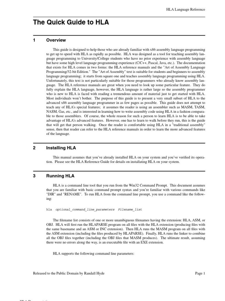 HLA is a command line tool that you run from the Win32 Command Prompt. This document assumes that you are familiar with basic command prompt syntax and youre familiar with various commands like "DIR" and "RENAME". To run HLA from the command line prompt, you use a command like the following: