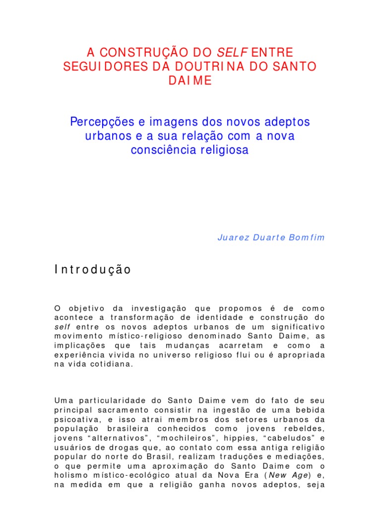 O objetivo da investigao que propomos de como acontece a transformao de identidade e construo do self entre os novos adeptos urbanos de um significativo movimento mstico-religioso denominado Santo Daime, as implicaes que tais mudanas acarretam e como a experincia vivida no universo religioso f lui ou apropriada na vida cotidiana.