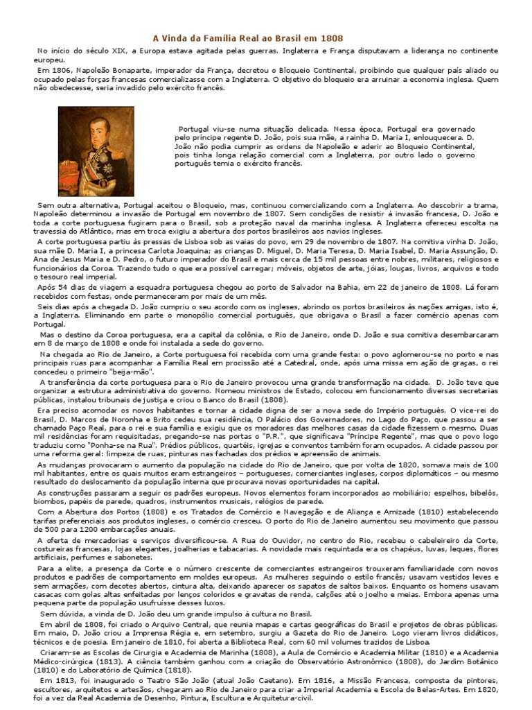 No incio do sculo XIX, a Europa estava agitada pelas guerras. Inglaterra e Frana disputavam a liderana no continente europeu. Em 1806, Napoleo Bonaparte, imperador da Frana, decretou o Bloqueio Continental, proibindo que qualquer pas aliado ou ocupado pelas foras francesas comercializasse com a Inglaterra. O objetivo do bloqueio era arruinar a economia inglesa. Quem no obedecesse, seria invadido pelo exrcito francs.