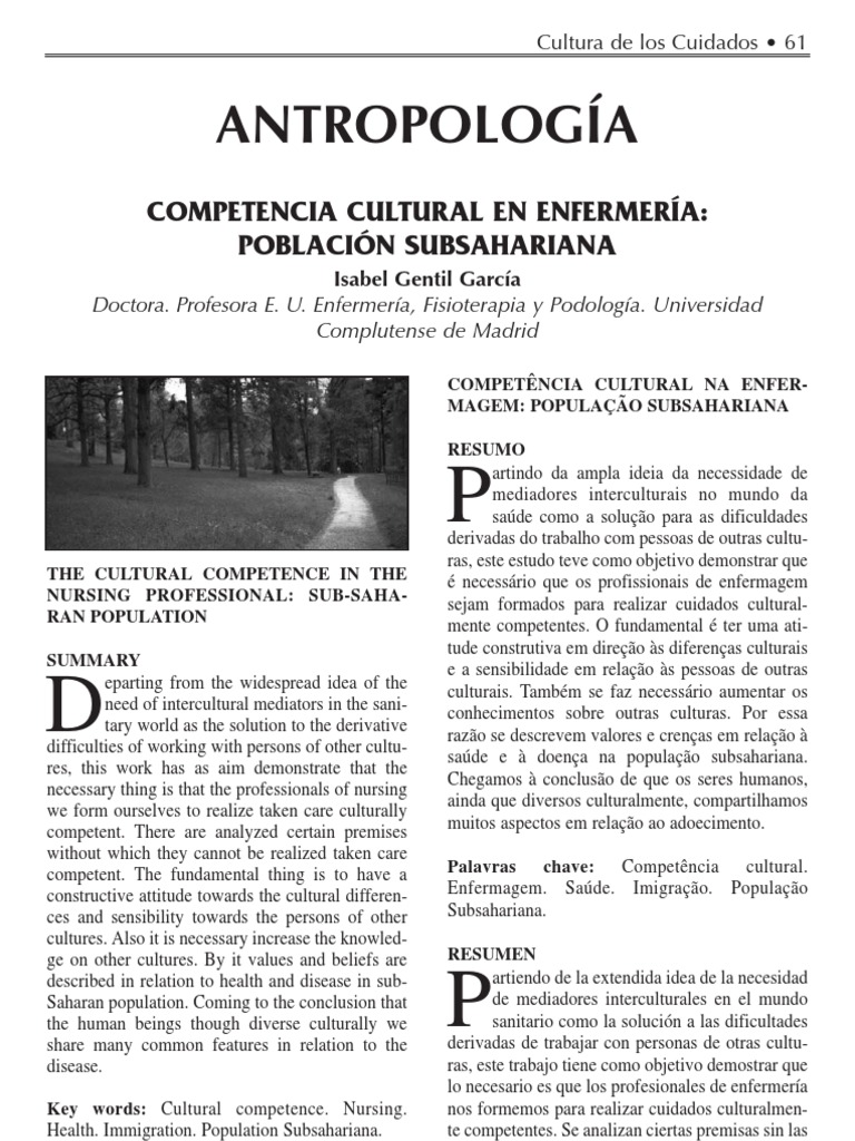 cuales no se pueden realizar cuidados competentes. Lo fundamental es tener una actitud constructiva hacia las diferencias culturales y sensibilidad hacia las personas de otras culturas. Tambin se necesita aumentar los conocimientos sobre otras culturas. Por ello se describen valores y creencias en relacin a salud y enfermedad en poblacin subsahariana. Llegando a la conclusin que los humanos aunque diversos culturalmente compartimos muchos rasgos comunes en relacin a la enfermedad. Palabras clave: Enfermera. Salud. Subsahariana. Competencia cultural. Inmigracin. Poblacin estos momentos hemos incorporado la informtica como una herramienta ms de nuestro trabajo. Si unos aos atrs cuando ello se inici hubiramos optado por proclamar la necesidad de mediadores informticos, hoy seramos incompetentes para nuestro trabajo. Lo que hay que reclamar es formacin para ser competentes culturalmente, como un elemento ms de nuestra competencia profesional. Todava ms importante: mientras reclamemos la presencia de mediadores interculturales mantendremos, sin pretenderlo, en situacin de exclusin al colectivo cultural diferente. Conocer otros conceptos de salud y enfermedad, hbitos dietticos, creencias religiosas, mitos, costumbres, conductas es adaptarnos a nuevas necesidades, centrndonos en la persona enferma ms que en la enfermedad. Somos los profesionales de enfermera los que ms entendemos que no hay cuerpo-mquina enfermo, sino personas con enfermedad, por esto debemos orientarnos hacia el cuidado cultural competente. CUIDADO CULTURAL COMPETENTE Numerosos profesionales de Enfermera que nos han precedido en tiempos histricos lo han practicado, aunque no le dieran este nombre. En los aos 50 del siglo pasado, Madeleine Leininger, enfermera y antroploga, se anticip a Organismos Internacionales para elaborar el concepto (Siles, 2001). Leininger considera que la competencia cultural es un imperativo para las enfermeras si queremos realizar nuestra funcin con efectividad. Entendi que sumar cuidados y sociedad multicultural daba como resultado Enfermera Transcultural (ETC), definindola como el rea formal de estudio y trabajo centrado en el cuidado basado en la cultura, creencias de salud o enfermedad, valores y prcticas de las personas, para ayudarlas a mantener o recuperar su salud, hacer frente a sus discapacidades o a su muerte. El objetivo de ETC es proporcionar cuidados culturalmente competentes, (Leininger, 1999) En los aos 80, la OMS reconoce la importancia de la cultura y de la diversidad cultural en el proceso salud-enfermedad y se plantea cmo mejor atender sanitariamente a las minoras tnicas con diferentes culturas y lenguas, (Herman, 2007)