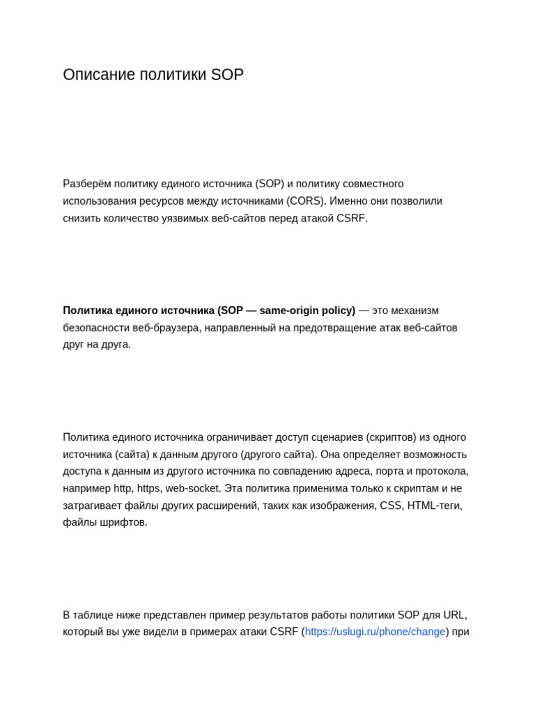 Политика SOP не предотвращает CSRF-атаку, а позволяет запрещать