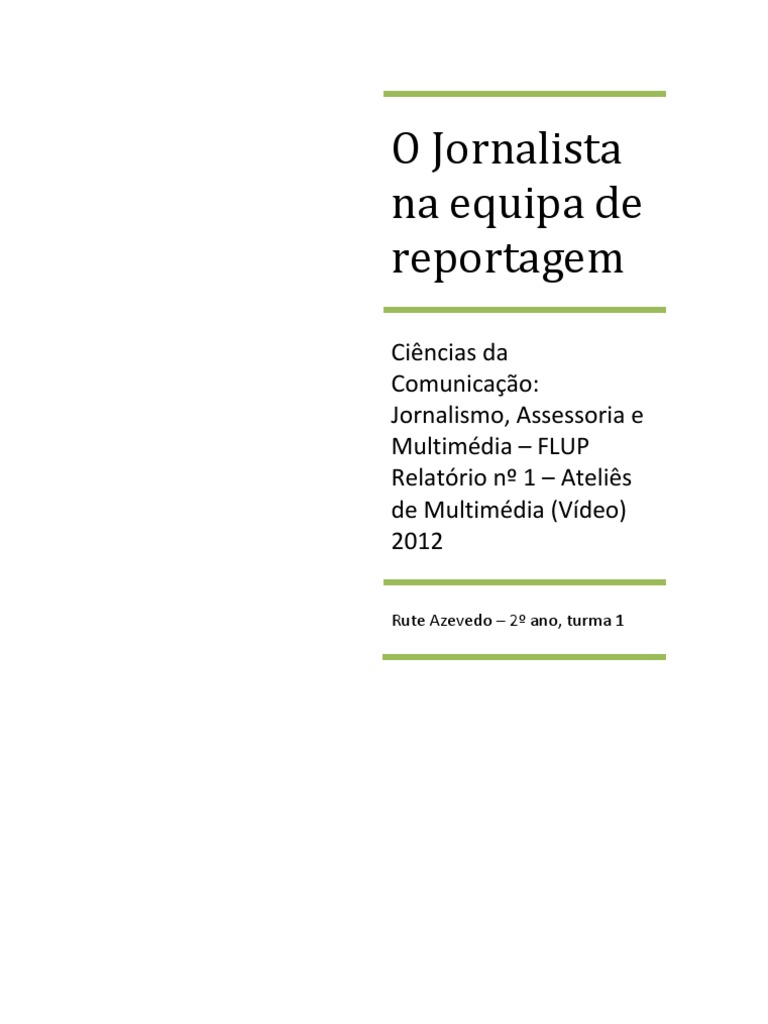 O presente relatrio tem como objetivo refletir sobre a funo tcnica que vou desempenhar no programa de televiso realizado no mbito do programa de Atelis de Multimdia Vdeo com os professores Jos Alberto Pinto e Francisco Vidinha. No contexto deste programa, a minha funo ser a de jornalista numa das equipas de reportagem da turma e ficarei responsvel por duas das reportagens do programa. Ao longo do relatrio, tentarei explorar o papel do jornalista numa equipa de reportagem com base na minha viso pessoal e crtica suportada com bibliografia sobre o assunto. Este relatrio assim como toda a pesquisa que lhe est inerente serviro para aprofundar o meu conhecimento sobre as tcnicas de jornalismo em reportagem, a funo do jornalista e a importncia na construo da pea/reportagem e, sobretudo, permitir-me-o guiar o meu trabalho neste projeto e maximizar o meu desempenho.