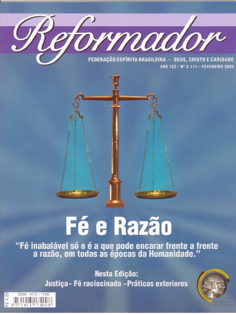Diretor Nestor Joo Masotti; Diretor-Substituto e Editor Altivo Ferreira; Redatores Affonso Borges Gallego Soares, Antonio Cesar Perri de Carvalho, Evandro Noleto Bezerra e Lauro de Oliveira So Thiago; Secretria Snia Regina Ferreira Zaghetto; Gerente Amaury Alves da Silva; REFORMADOR: Registro de Publicao no 121.P.209/73 (DCDP do Departamento de Polcia Federal do Ministrio da Justia), CNPJ 33.644.857/0002-84 I. E. 81.600.503. Departamento Editorial e Grfico Rua Souza Valente, 17 20941-040 Rio de Janeiro (RJ) Brasil Tel.: (21) 2187-8282; Fax: (21) 2187-8298 E-mail: redacao.reformador@febrasil.org.br E-mail: assinaturas.reformador@febrasil.org.br Capa: J. VICTTOR