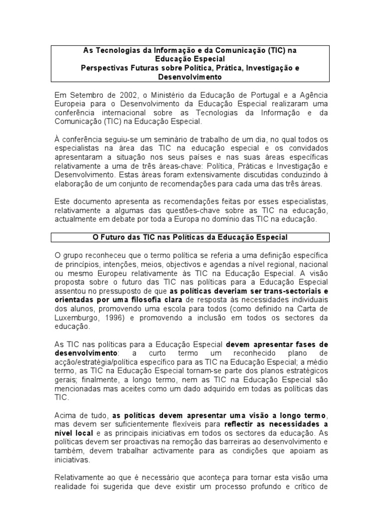 o Ministrio da Educao de Portugal e a Agncia Europeia para o Desenvolvimento da Educao Especial realizaram uma conferncia internacional sobre as Tecnologias da Informao e da Comunicao (TIC) na Educao Especial. conferncia seguiu-se um seminrio de trabalho de um dia, no qual todos os especialistas na rea das TIC na educao especial e os convidados apresentaram a situao nos seus pases e nas suas reas especficas relativamente a uma de trs reas-chave: Poltica, Prticas e Investigao e Desenvolvimento. Estas reas foram extensivamente discutidas conduzindo elaborao de um conjunto de recomendaes para cada uma das trs reas. Este documento apresenta as recomendaes feitas por esses especialistas, relativamente a algumas das questes-chave sobre as TIC na educao, actualmente em debate por toda a Europa no domnio das TIC na educao. O Futuro das TIC nas Polticas da Educao Especial O grupo reconheceu que o termo poltica se referia a uma definio especfica de princpios, intenes, meios, objectivos e agendas a nvel regional, nacional ou mesmo Europeu relativamente s TIC na Educao Especial. A viso proposta sobre o futuro das TIC nas polticas para a Educao Especial assentou no pressuposto de que as polticas deveriam ser trans-sectoriais e orientadas por uma filosofia clara de resposta s necessidades individuais dos alunos, promovendo uma escola para todos (como definido na Carta de Luxemburgo, 1996) e promovendo a incluso em todos os sectores da educao. As TIC nas polticas para a Educao Especial devem apresentar fases de desenvolvimento: a curto termo um reconhecido plano de aco/estratgia/poltica especfico para as TIC na Educao Especial; a mdio termo, as TIC na Educao Especial tornam-se parte dos planos estratgicos gerais; finalmente, a longo termo, nem as TIC na Educao Especial so mencionadas mas aceites como um dado adquirido em todas as polticas das TIC. Acima de tudo, as polticas devem apresentar uma viso a longo termo, mas devem ser suficientemente flexveis para reflectir as necessidades a nvel local e as principais iniciativas em todos os sectores da educao. As polticas devem ser proactivas na remoo das barreiras ao desenvolvimento e tambm, devem trabalhar activamente para as condies que apoiam as iniciativas. Relativamente ao que necessrio que acontea para tornar esta viso uma realidade foi sugerida que deve existir um processo profundo e crtico de