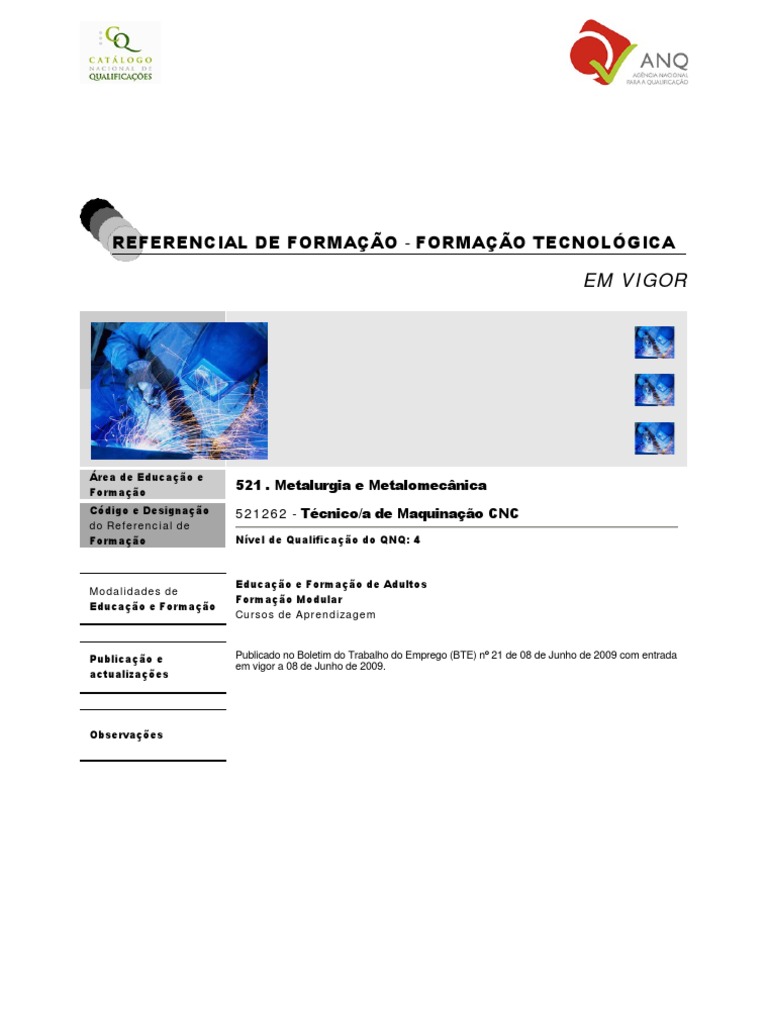 REFERENCIAL DE FORMAÇÃO - FORMAÇÃO TECNOLÓGICA | Técnico/a de Maquinação CNC - Nível 4 | 24-03-2011