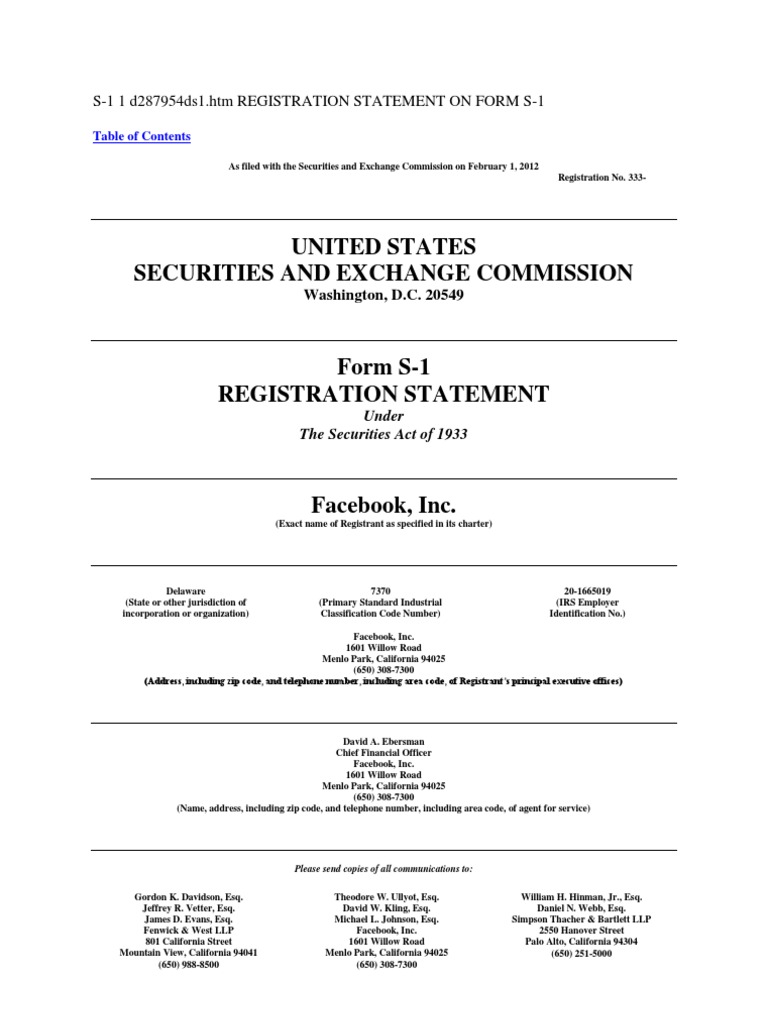 Prospectus Summary Risk Factors Special Note Regarding Forward-Looking Statements Industry Data and User Metrics Use of Proceeds Dividend Policy Capitalization Dilution Selected Consolidated Financial Data Managements Discussion and Analysis of Financial Condition and Results of Operations Letter from Mark Zuckerberg Business