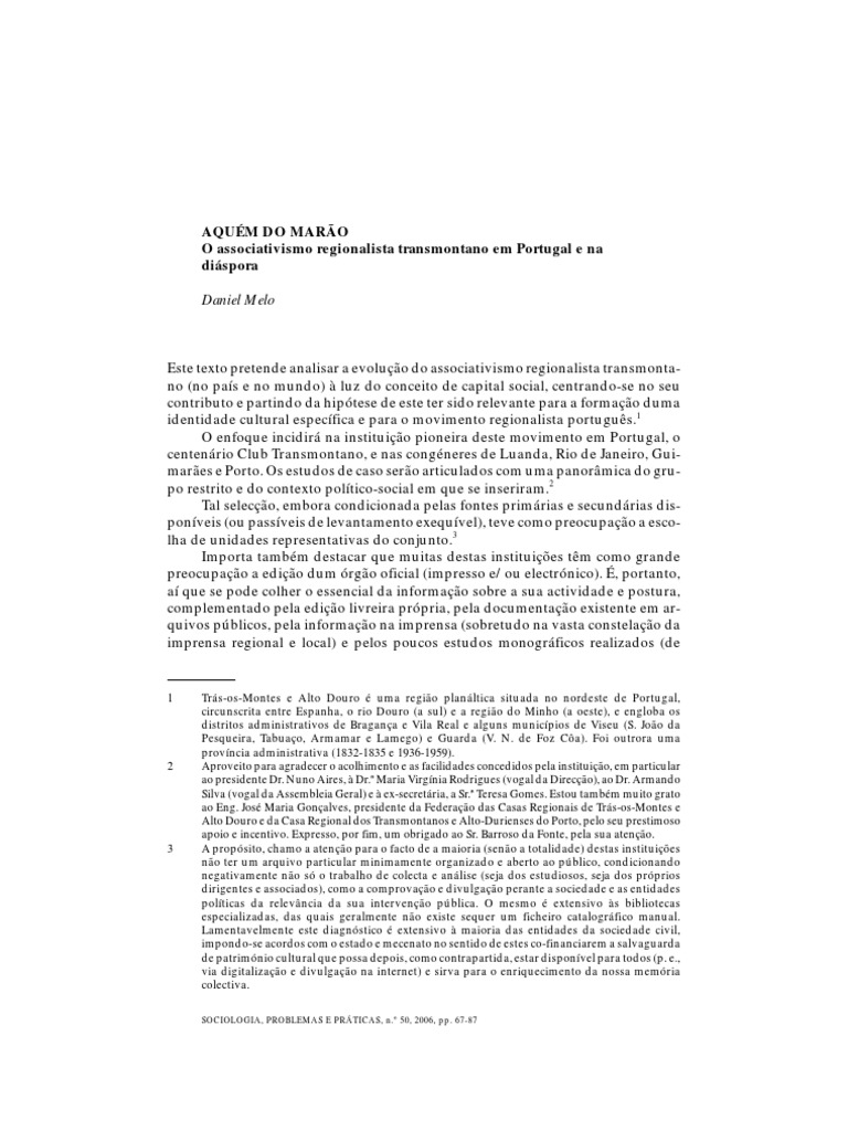 associations rgionalistes de Trs-os-Montes existant au Portugal et au sein de la diaspora. Lapproche utilise relie ltude de leur intervention institutionnelle aux concepts de capital social et didentit culturelle. Tels sont les vecteurs structurant leur agenda programmatique, sur lesquels repose leur reprsentativit au sein des mouvements associatif et rgionaliste. Mots-cls Associativisme, capital social, identit culturelle, rgionalisme.