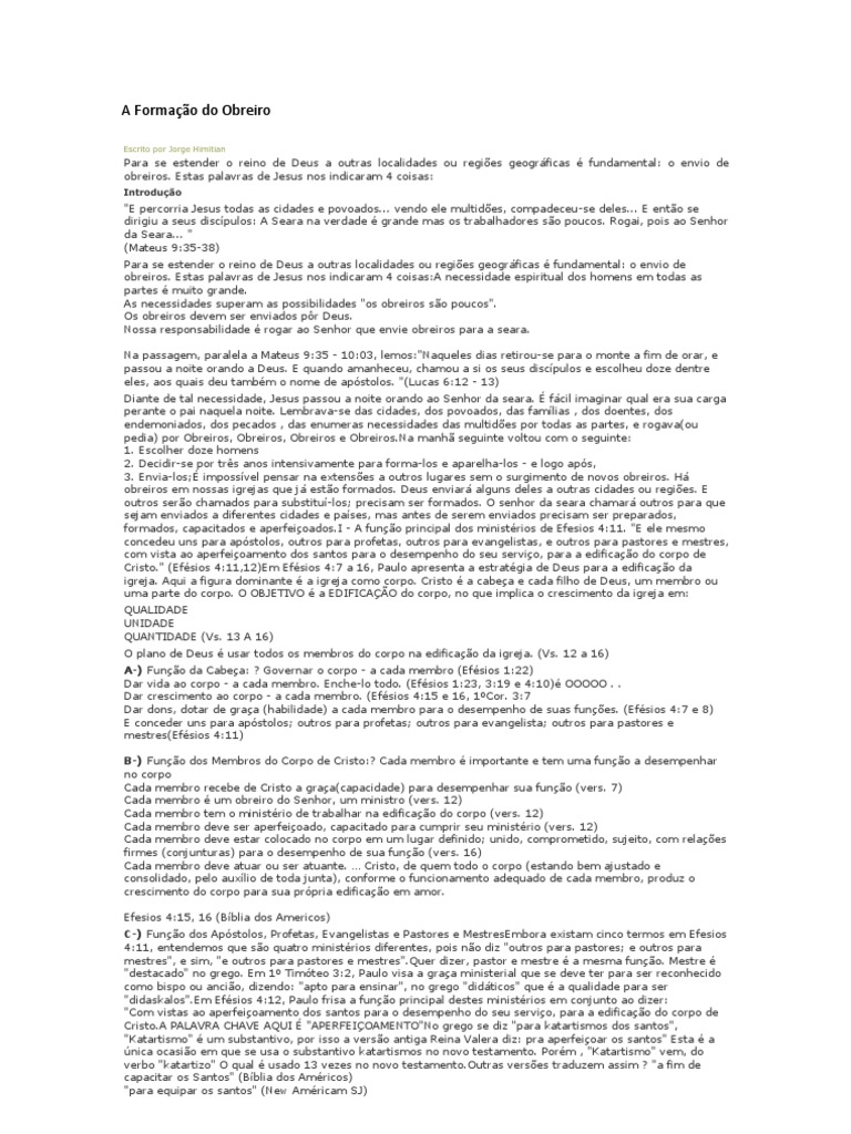"E percorria Jesus todas as cidades e povoados... vendo ele multides, compadeceu-se deles... E ento se dirigiu a seus discpulos: A Seara na verdade grande mas os trabalhadores so poucos. Rogai, pois ao Senhor da Seara... " (Mateus 9:35-38) Para se estender o reino de Deus a outras localidades ou regies geogrficas fundamental: o envio de obreiros. Estas palavras de Jesus nos indicaram 4 coisas:A necessidade espiritual dos homens em todas as partes muito grande. As necessidades superam as possibilidades "os obreiros so poucos". Os obreiros devem ser enviados pr Deus. Nossa responsabilidade rogar ao Senhor que envie obreiros para a seara. Na passagem, paralela a Mateus 9:35 - 10:03, lemos:"Naqueles dias retirou-se para o monte a fim de orar, e passou a noite orando a Deus. E quando amanheceu, chamou a si os seus discpulos e escolheu doze dentre eles, aos quais deu tambm o nome de apstolos. "(Lucas 6:12 - 13) Diante de tal necessidade, Jesus passou a noite orando ao Senhor da seara. fcil imaginar qual era sua carga perante o pai naquela noite. Lembrava-se das cidades, dos povoados, das famlias , dos doentes, dos endemoniados, dos pecados , das enumeras necessidades das multides por todas as partes, e rogava(ou pedia) por Obreiros, Obreiros, Obreiros e Obreiros.Na manh seguinte voltou com o seguinte: 1. Escolher doze homens 2. Decidir-se por trs anos intensivamente para forma-los e aparelha-los - e logo aps, 3. Envia-los; impossvel pensar na extenses a outros lugares sem o surgimento de novos obreiros. H obreiros em nossas igrejas que j esto formados. Deus enviar alguns deles a outras cidades ou regies. E outros sero chamados para substitu-los; precisam ser formados. O senhor da seara chamar outros para que sejam enviados a diferentes cidades e pases, mas antes de serem enviados precisam ser preparados, formados, capacitados e aperfeioados.I - A funo principal dos ministrios de Efesios 4:11. "E ele mesmo concedeu uns para apstolos, outros para profetas, outros para evangelistas, e outros para pastores e mestres, com vista ao aperfeioamento dos santos para o desempenho do seu servio, para a edificao do corpo de Cristo." (Efsios 4:11,12)Em Efsios 4:7 a 16, Paulo apresenta a estratgia de Deus para a edificao da igreja. Aqui a figura dominante a igreja como corpo. Cristo a cabea e cada filho de Deus, um membro ou uma parte do corpo. O OBJETIVO a EDIFICAO do corpo, no que implica o crescimento da igreja em: QUALIDADE UNIDADE QUANTIDADE (Vs. 13 A 16) O plano de Deus usar todos os membros do corpo na edificao da igreja. (Vs. 12 a 16) A-) Funo da Cabea: ? Governar o corpo - a cada membro (Efsios 1:22) Dar vida ao corpo - a cada membro. Enche-lo todo. (Efsios 1:23, 3:19 e 4:10) OOOOO . . Dar crescimento ao corpo - a cada membro. (Efsios 4:15 e 16, 1Cor. 3:7 Dar dons, dotar de graa (habilidade) a cada membro para o desempenho de suas funes. (Efsios 4:7 e 8) E conceder uns para apstolos; outros para profetas; outros para evangelista; outros para pastores e mestres(Efsios 4:11) B-) Funo dos Membros do Corpo de Cristo:? Cada membro importante e tem uma funo a desempenhar no corpo Cada membro recebe de Cristo a graa(capacidade) para desempenhar sua funo (vers. 7) Cada membro um obreiro do Senhor, um ministro (vers. 12) Cada membro tem o ministrio de trabalhar na edificao do corpo (vers. 12) Cada membro deve ser aperfeioado, capacitado para cumprir seu ministrio (vers. 12) Cada membro deve estar colocado no corpo em um lugar definido; unido, comprometido, sujeito, com relaes firmes (conjunturas) para o desempenho de sua funo (vers. 16) Cada membro deve atuar ou ser atuante. Cristo, de quem todo o corpo (estando bem ajustado e consolidado, pelo auxlio de toda junta), conforme o funcionamento adequado de cada membro, produz o crescimento do corpo para sua prpria edificao em amor. Efesios 4:15, 16 (Bblia dos Americos) C-) Funo dos Apstolos, Profetas, Evangelistas e Pastores e MestresEmbora existam cinco termos em Efesios 4:11, entendemos que so quatro ministrios diferentes, pois no diz "outros para pastores; e outros para mestres", e sim, "e outros para pastores e mestres".Quer dizer, pastor e mestre a mesma funo. Mestre "destacado" no grego. Em 1 Timteo 3:2, Paulo visa a graa ministerial que se deve ter para ser reconhecido como bispo ou ancio, dizendo: "apto para ensinar", no grego "didticos" que a qualidade para ser "didaskalos".Em Efsios 4:12, Paulo frisa a funo principal destes ministrios em conjunto ao dizer: "Com vistas ao aperfeioamento dos santos para o desempenho do seu servio, para a edificao do corpo de Cristo.A PALAVRA CHAVE AQUI "APERFEIOAMENTO"No grego se diz "para katartismos dos santos", "Katartismo" um substantivo, por isso a verso antiga Reina Valera diz: pra aperfeioar os santos" Esta a nica ocasio em que se usa o substantivo katartismos no novo testamento. Porm , "Katartismo" vem, do verbo "katartizo" O qual usado 13 vezes no novo testamento.Outras verses traduzem assim ? "a fim de capacitar os Santos" (Bblia dos Amricos) "para equipar os santos" (New Amricam SJ)