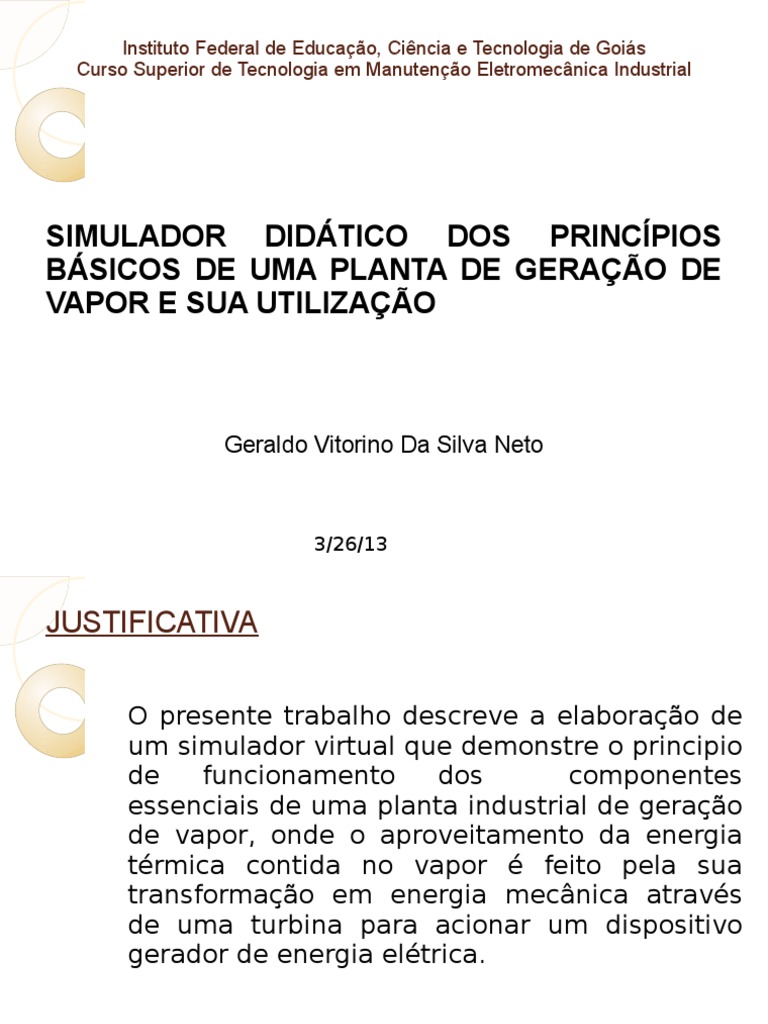 O presente trabalho descreve a elaborao de um simulador virtual que demonstre o principio de funcionamento dos componentes essenciais de uma planta industrial de gerao de vapor, onde o aproveitamento da energia trmica contida no vapor feito pela sua transformao em energia mecnica atravs de uma turbina para acionar um dispositivo gerador de energia eltrica.