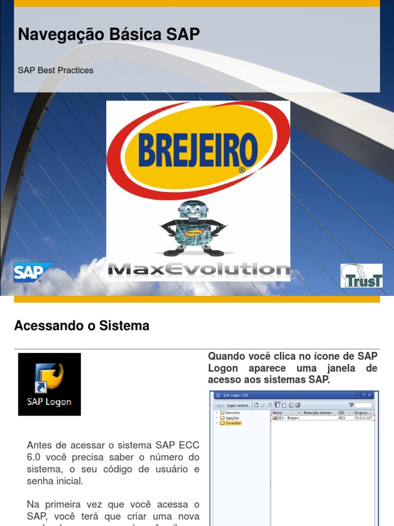 Antes de acessar o sistema SAP ECC 6.0 voc precisa saber o nmero do sistema, o seu cdigo de usurio e senha inicial. Na primeira vez que voc acessa o SAP, voc ter que criar uma nova senha de acesso, que s voc saiba. Esta senha precisa ser mantida em segredo.